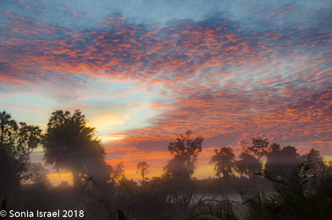 The next morning, our “wake up” call, again a staff member coming down the bridge to our tent and yelling out “Good Morning,” came at 5:30. We quickly go up, got cleaned up and dressed, and went for our continental breakfast, ready to hit the road by 6:30. There was no real sunrise to be seen here as there are so many trees in the way. But it was getting lighter by the minute. We quickly rushed out to catch that beautiful morning light.
