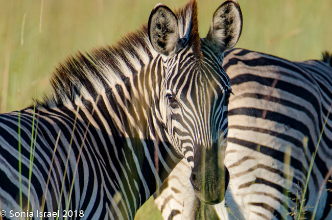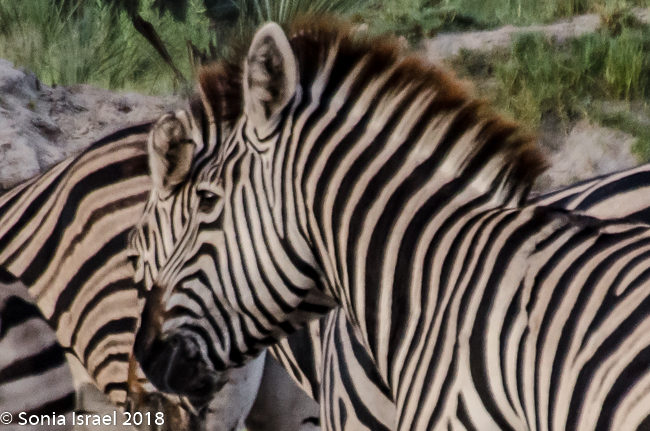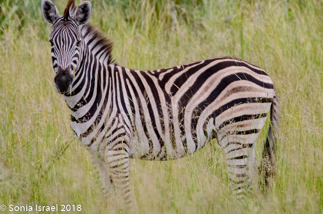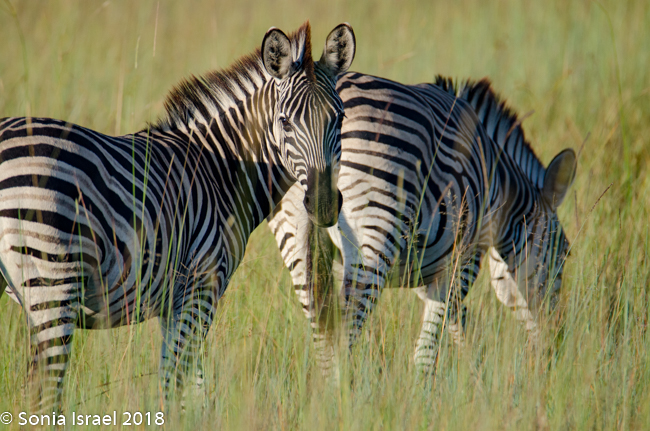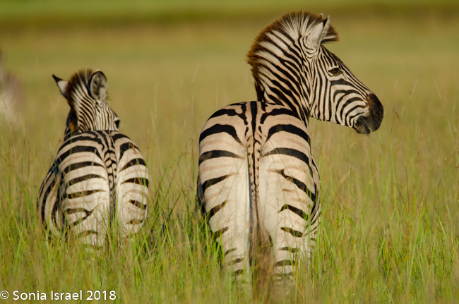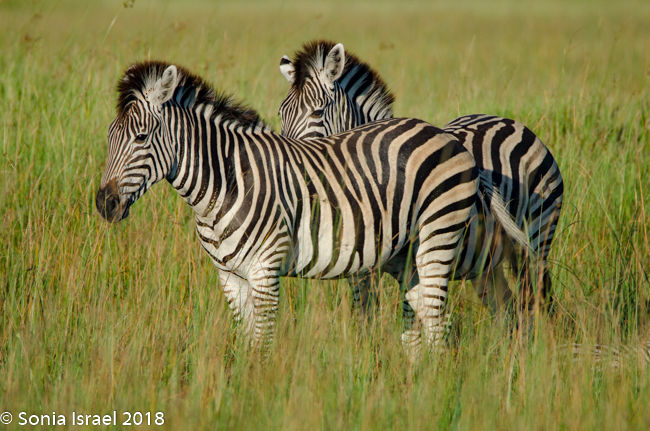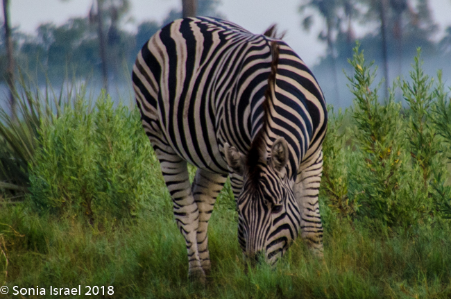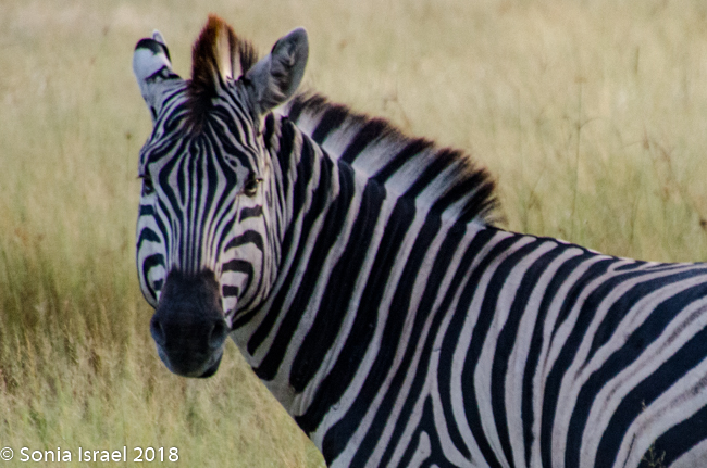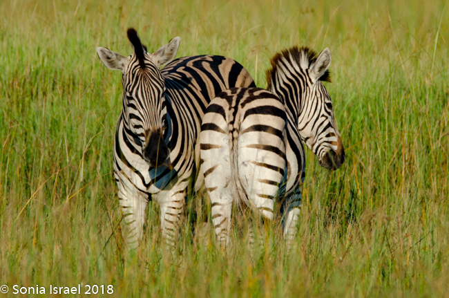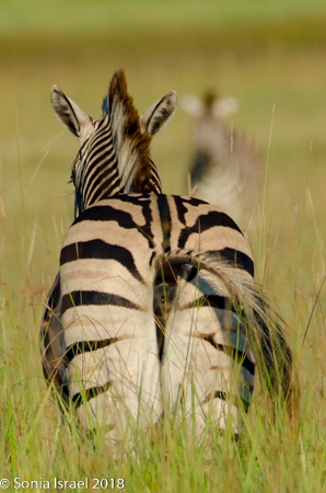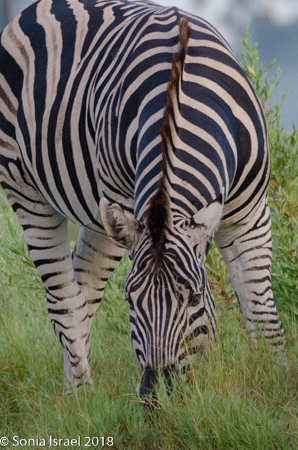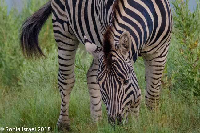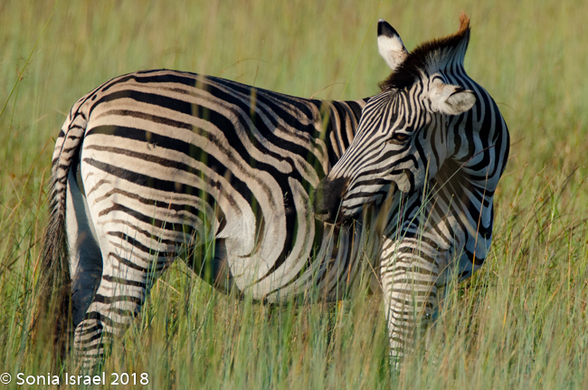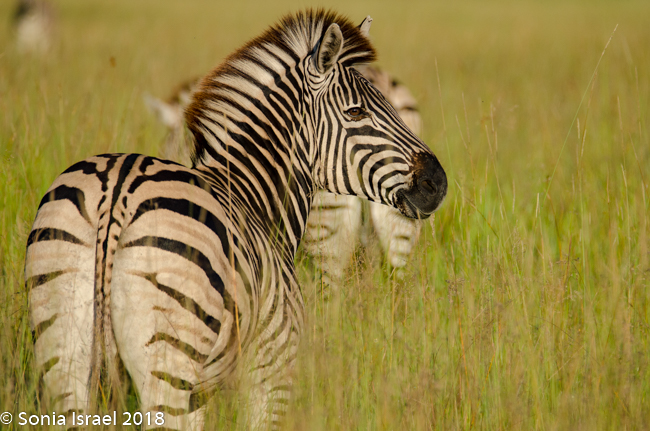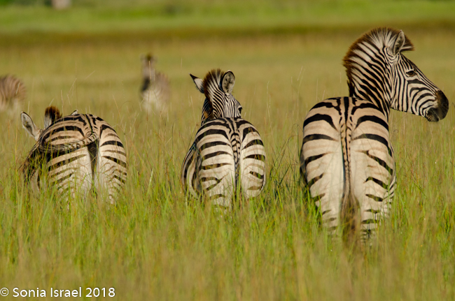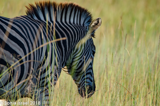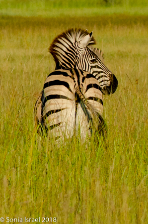 We saw lots and lots of Red Lechwes and warthogs, a giraffe or two. And then, just on the other side of the runway, there was a zebra. As we got closer we realized it was a whole dazzle of zebras (which is what a lot of zebras are called). I commented that this is one animal that is still beautiful even from behind. The stripes. The black and white designs. The white tail. They mostly stood with the backs to us, and then one would turn his head and we could see their eyes. Then they all started to move, slowly, slowly, into smaller groups, nibbling on the long grass, totally ignoring us. I could have watched them for hours. Magnificent creatures.