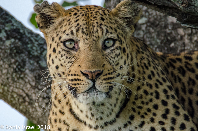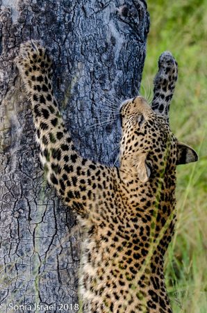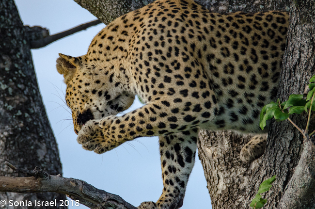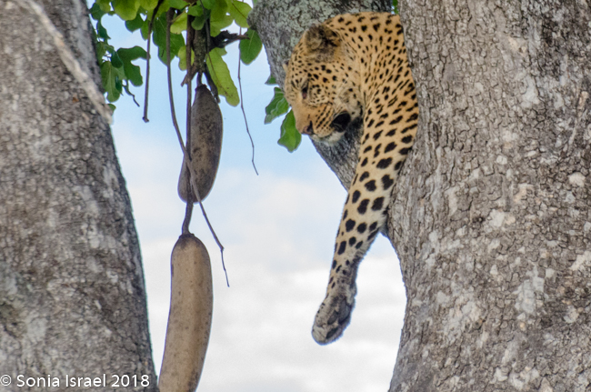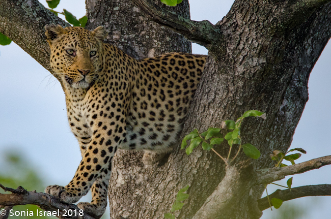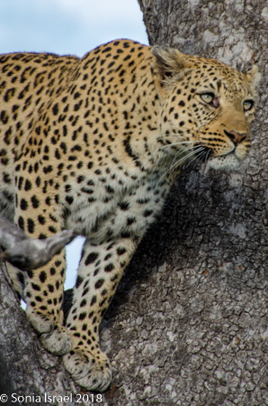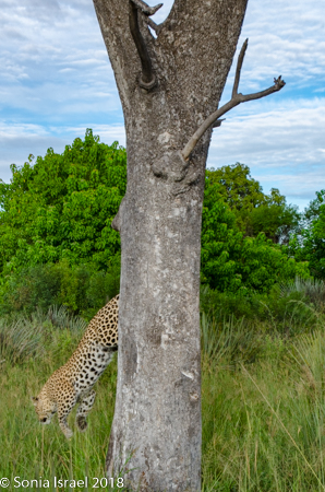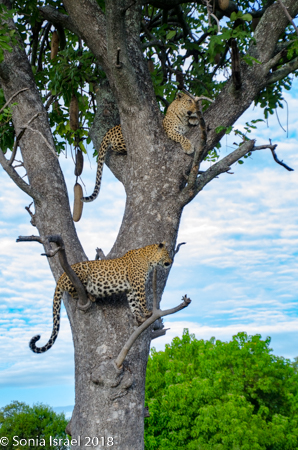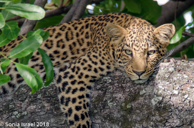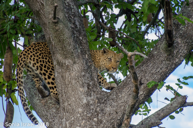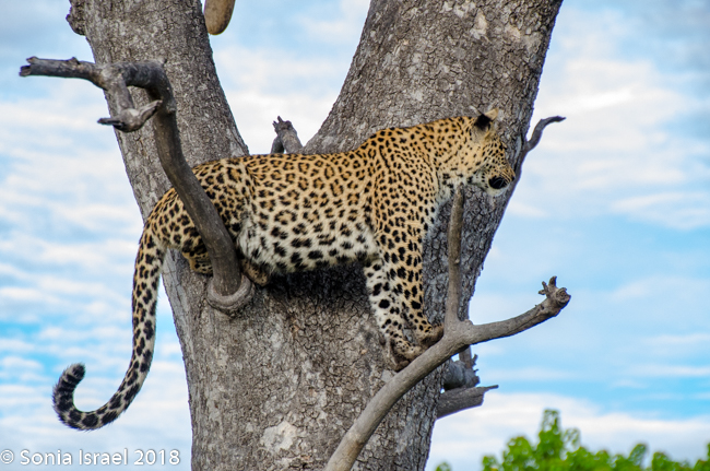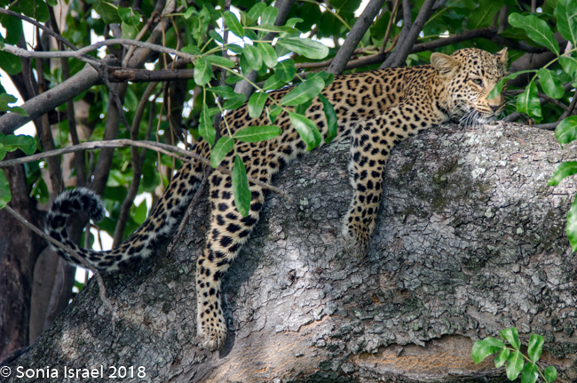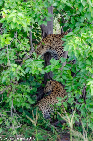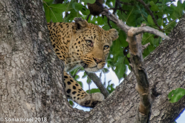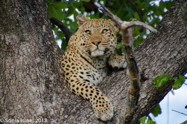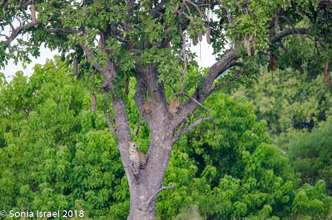 And while we were watching the dogs, Kitso took up his binoculars and looked across the fields into the trees on the other side, maybe a football field or two away. He saw two light brown spots in a tree and exclaimed: “Leopards.” We forgot all about the dogs and sped off to explore more carefully. Sure enough, there was a mother leopard in the upper crook of the tree and a cub (actually a teenager) in the lower crook. And as we got closer, we realized there was a third leopard, a second cub, on the ground, just under the tree. Bingo! We hit the jackpot.