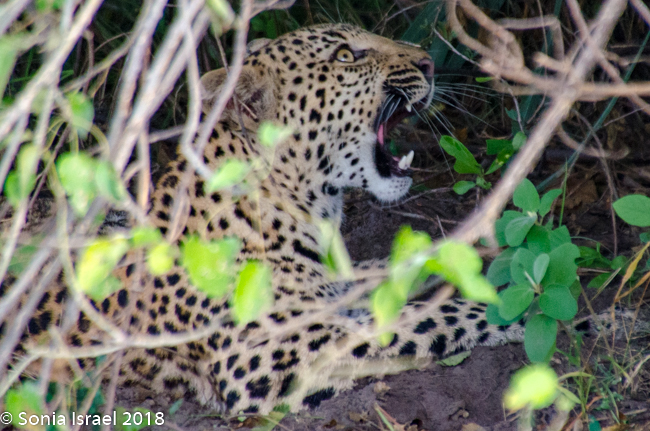 We slowly followed in our jeep as they crawled under a bush and staying there in the shade. She obviously felt safer now and decided they could get comfortable. We watched for a bit longer and then headed back to camp. Kitso told us that is was unusual to see a female leopard so active. We were lucky.