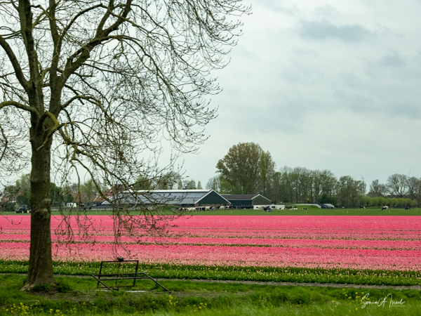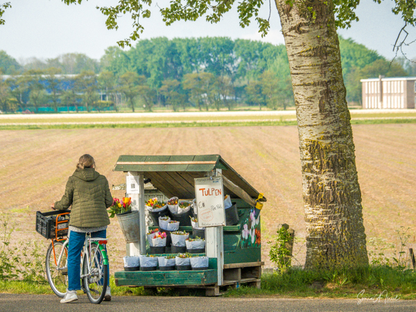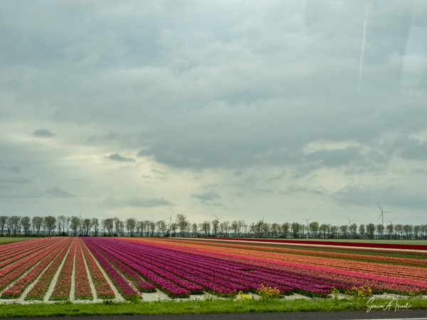 We drove from the port in Amsterdam, along roads lined with bridges, and canals and tulips. And of course windmills. Where ever you look in the Netherlands, at this time of year, you see tulips. We passed a stand along the side of the road where tulips were being sold. A woman on her bicycle had stopped to buy some. There was no one there. It was all on the honor system.