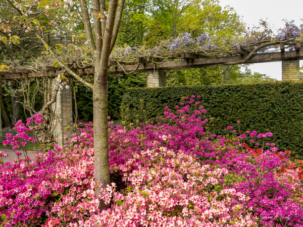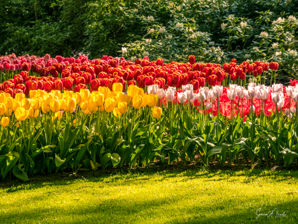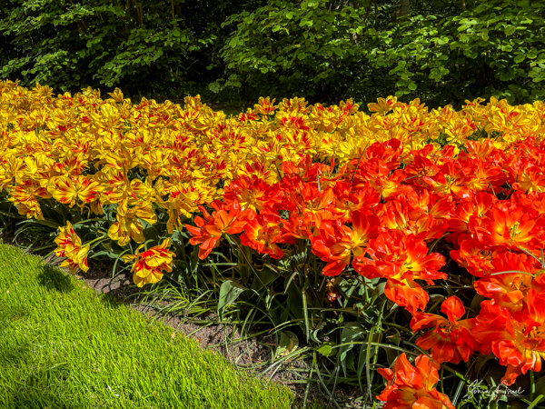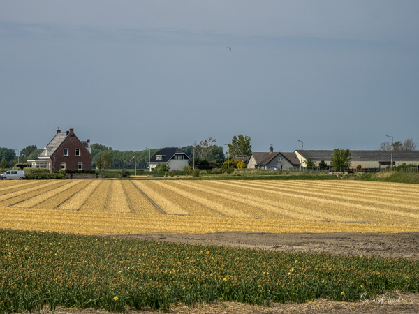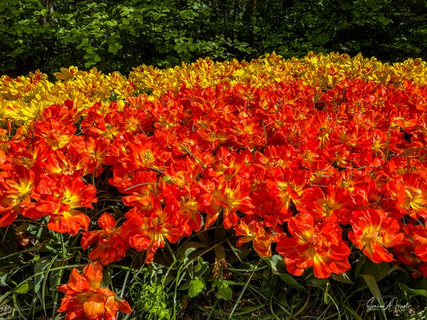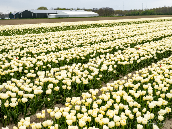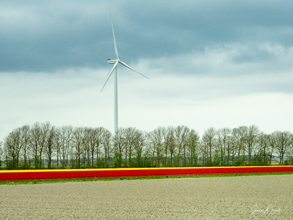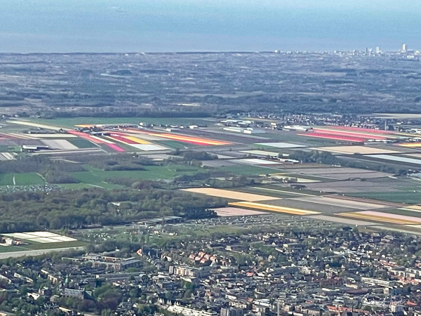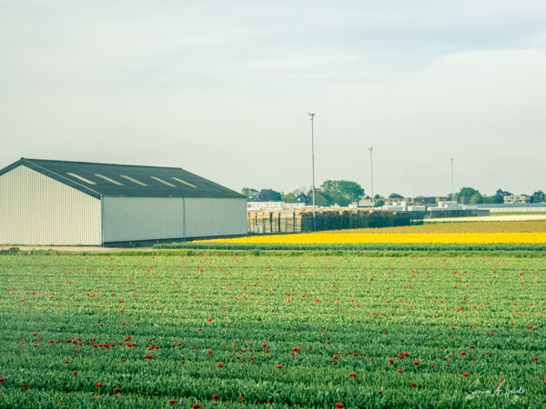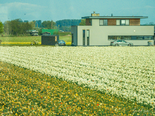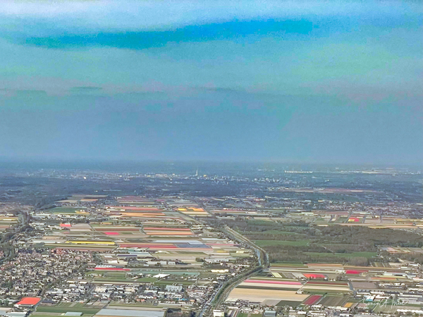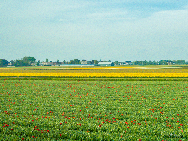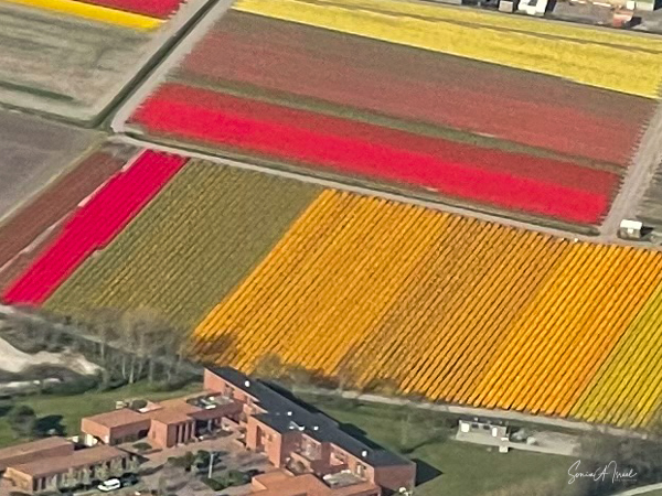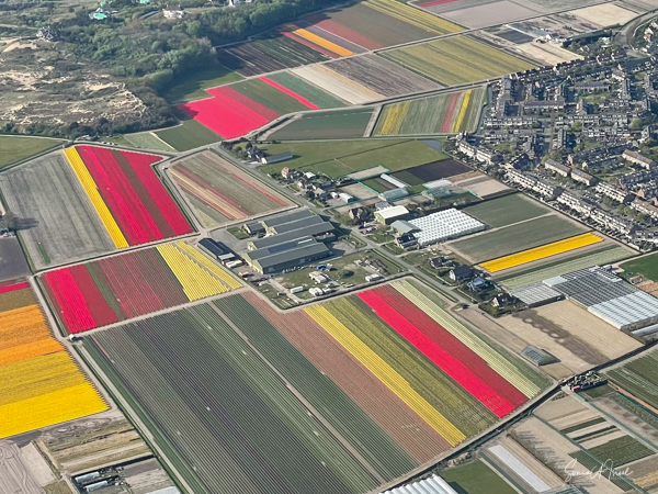 Bollenstreek, on the Dutch coast, is the region in The Netherlands where the tulips grow. The combination of excavated dunes and sea air make it just the right place for the flower bulbs to grow. And in fact, Bollenstreek’ means ‘flower region.’ It is not a large area, less than 24 miles long. But what a 24 miles it is, covered in stipes of color. We first saw it from the air as we approached the Amsterdam airport. I was sitting by the window, just gazing out when all of a sudden I realized that I was looking at tulips. I had waited a long time to see this sight and I was mesmerized by the patterns as seen from the sky. It reminded me of a Mondrian painting.