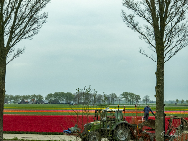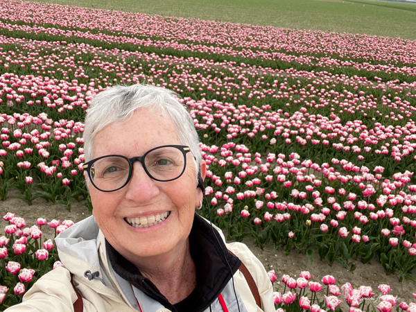 The fields and fields of flowers that we saw were only grown for the bulbs. As the flowers opened up, the heads of the flowers are cut off. Diana Van Der Tuuk, our cruise program director, grew up in the Bollenstreek area, surrounded by tulips and at age 12 she started working on a tulip farm during the summer vacation, doing just that, on her knees cutting off the flower (note by the way that Diana always wore her mask. She took it off for the picture only because we were outside) Now it is done by special machines that leave the bulbs intact, but cut off the flowers heads. When the flower is “beheaded,” all the energy goes into the bulbs. In late summer the bulbs are retrieved, washed, peeled and stored for replanting in October. In order to best retrieve the blubs, a net is placed under them when the are planted which keeps the clay ground from sticking to the bulb and makes it easier to lift them out of the ground.