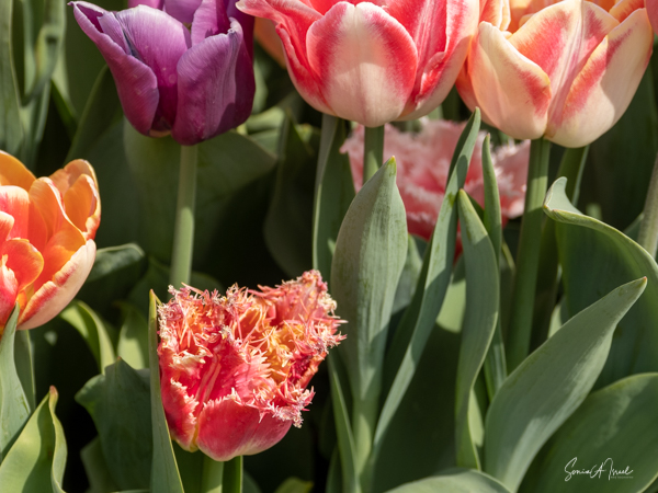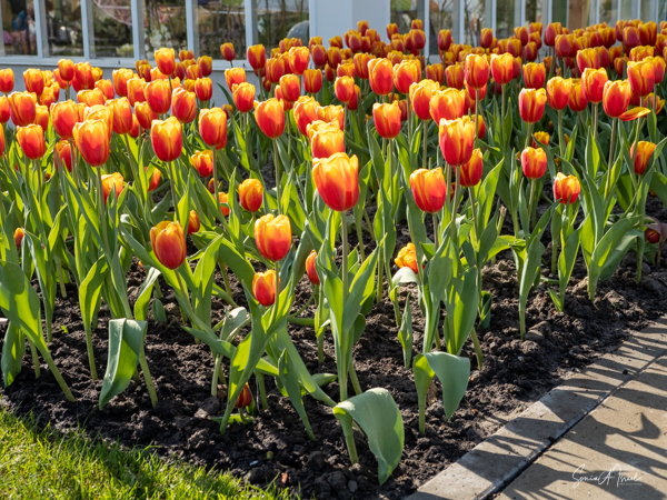 The walkways were lined with tulips in all colors. As I looked into the distance, I could see stripes of colors, like a tapestry of tulips. This is tulip season in Holland after all. As an aside, Alette taught us where the name “tulip” came from. In the mid-1500s, Ogier Ghiselin de Busbecq, a Flemish writer, herbalist and diplomat in the service of the Austrian monarchs, was ambassador to the Ottoman Empire in Constantinople. He met a Turkish man in a traditional turban with a sketch of a flower on it. He pointed to it and asked what it was, meaning the flower. The Turk misunderstood, and replied, “Tulipan,” meaning turban. Ojier thought that was the name of the flower, and thus the name “Tulip” was born.