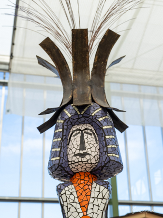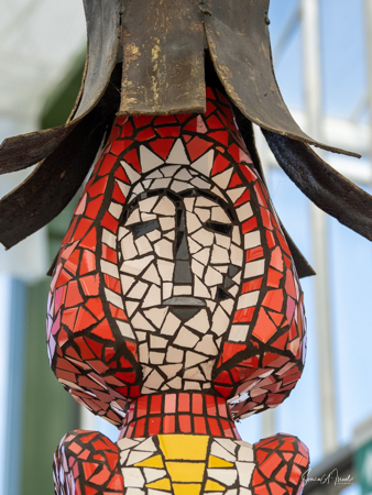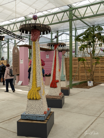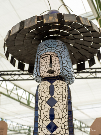 We made our way into the greenhouse and were welcomed by a long line of mosaic figures in all colors. Now those were statues I would have loved to have in my own backyard. Each was a different color and each was a bit unique. Other than beautiful art, there was no explanation that I could find about the significance of these mosaics to sustainability.