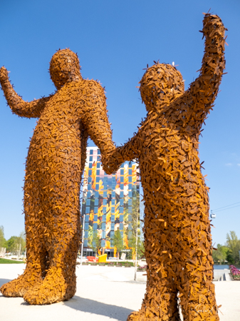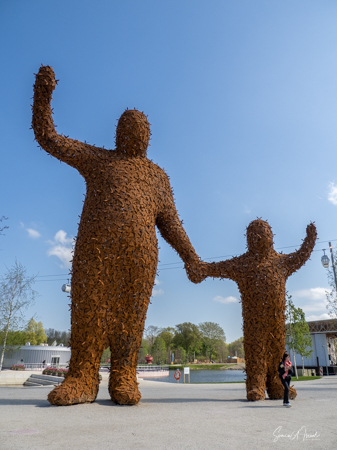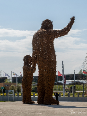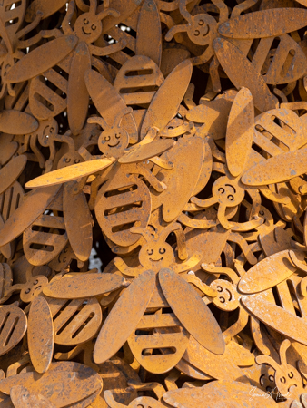 Just outside the care home was a large sculpture of ice cream on sticks and a bit further away was a very large sculpture of what to me looked like a man holding the hand of a child. For the distance I thought it was a topiary, but as I got closer and looked at it, I realized it was made of metal bees. So while the ice cream was just fun art, the sculpture of people and bees was a message of how important bees are for sustaining the early and we must live with them.