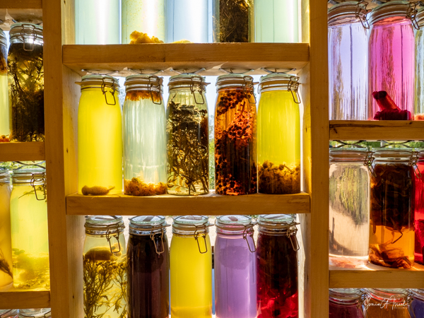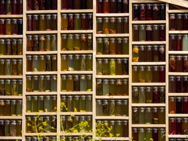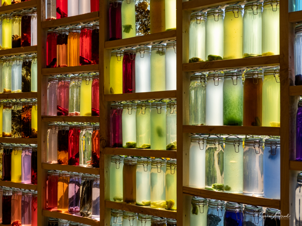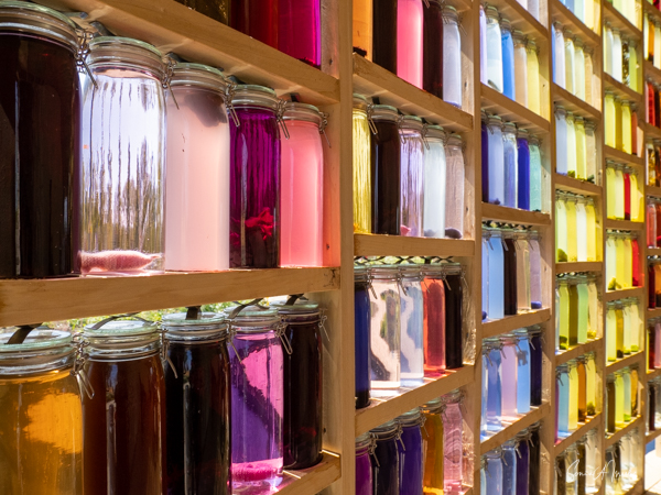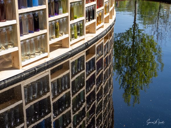 Our next stop was the Wolunie. This pavilion used shades of nature to show what can be done with the energy of the sun. There were glass jars along a circular wall, each filled with different colored water that had been dyed with vegetables. There was also a wall with felt, with feathers and with leather, each showing what can be done with natural products. The reflection of the colored bottles in the pond in front was beautiful, looking almost like stained glass.