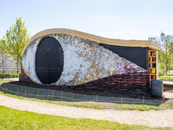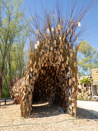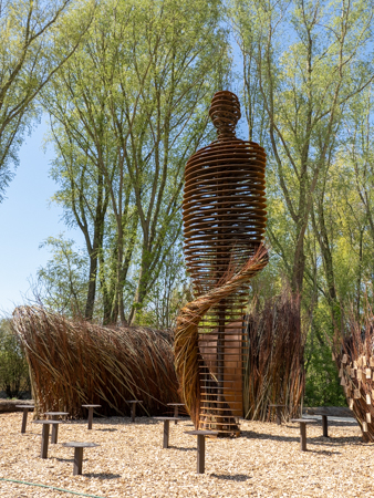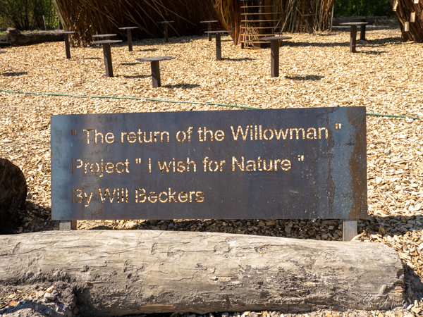 After a lunch of empanadas, we crossed over to Utopia Island – the land of the future. There was an education section where 11-year olds were invited to grow their own garden. They are taught about sustainability. We learned about the willow tree and how its branches can be used to weave baskets etc. There was a Horn of Plenty made of willow where the kids all wrote messages about the future of our earth, alongside a very large man, also made in part of willow.