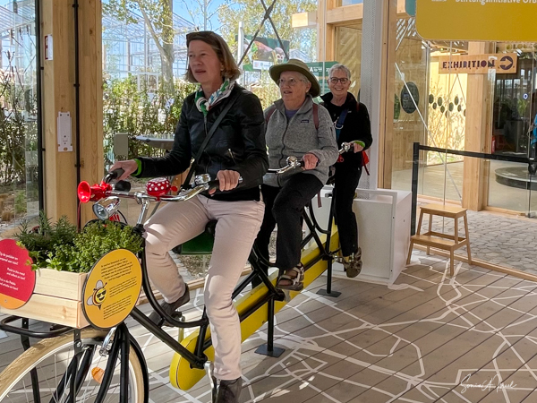 We were getting a bit tired at this point as we had walked and walked and walked. It was time for a cappuccino. We found ourselves by the Germany pavilion which had a “Coffee and Kuchen” kitchen. But first, we were enticed into the Biotopia. We were given plastic green bracelets and were instructed to answer questions or interact with exhibits to collect “coins.” Our competitive spirit took over and off we went, gathering up the last bit of our energy. We rode a bicycle built for three to create energy. We balanced ourselves on large disc. We answered questions about solar. And or course, we collected all the coins. At the end of the exhibit, we tossed our bracelets into a hole and our results were displayed on a large screen which congratulated us on doing so well. Ah, ego.