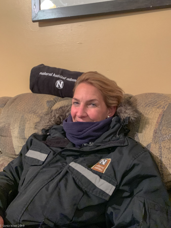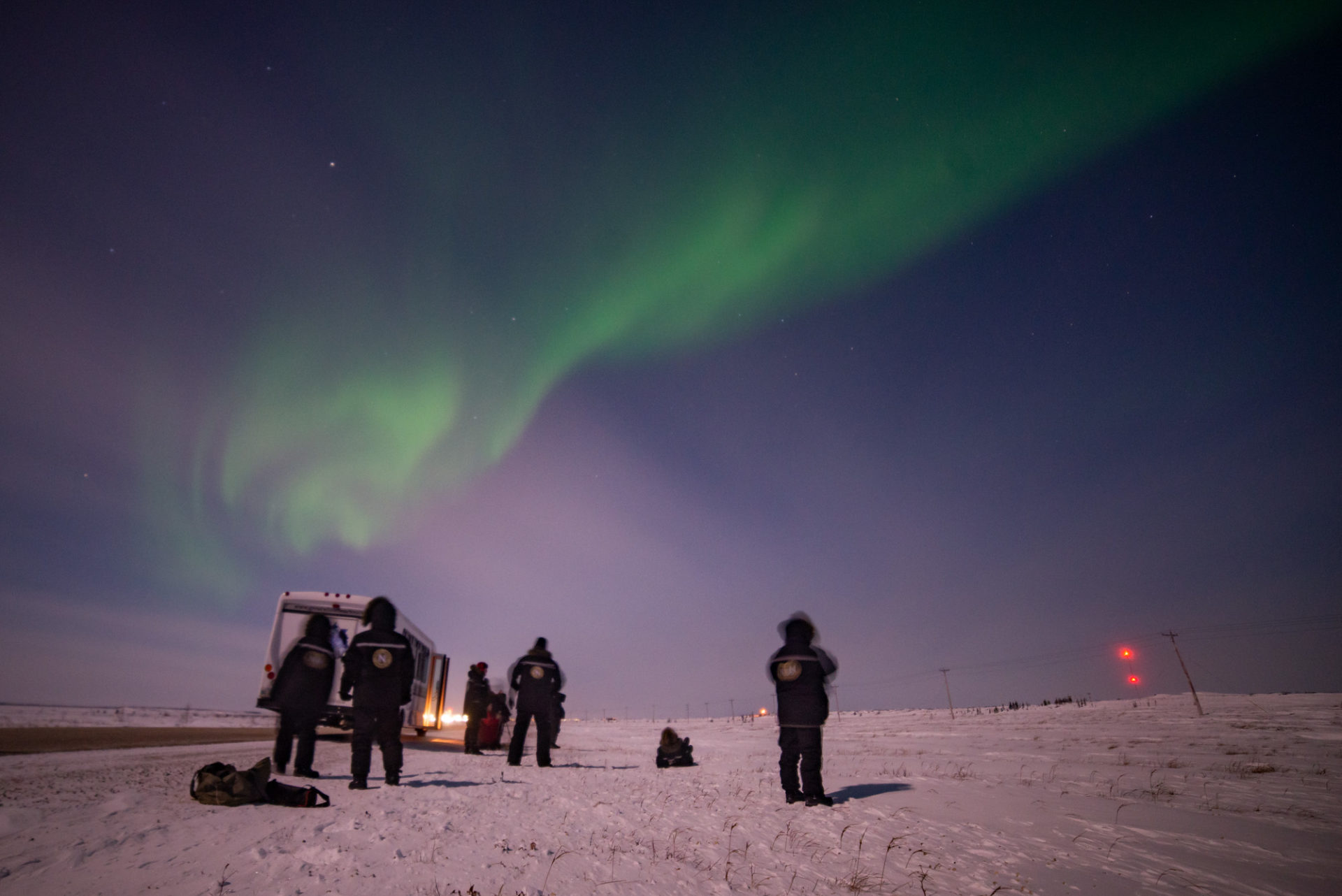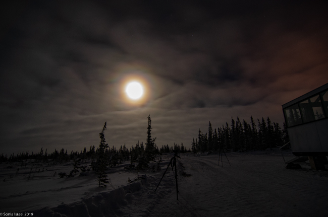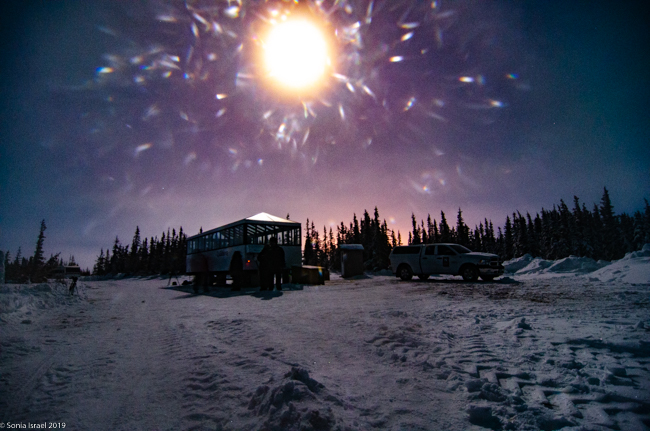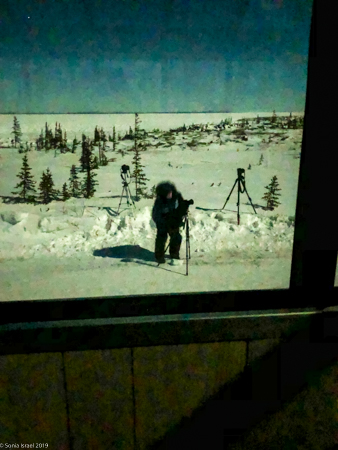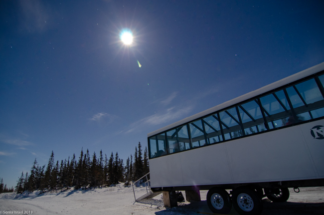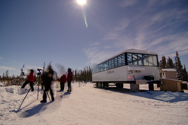 On our first night in Churchill, we bundled up with 3 layers of long underwear, fleece pants, lined waterproof pants, two layers of wool socks and boots, fleece jacket, down jacket, neck warmer, hat, glove liners and gloves. And hand and foot warmers in our boots and gloves. Now that we could barely move, we grabbed our camera gear and wobbled to the bus that would take us to our first viewing sight at the Aurora Pod.