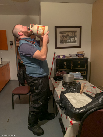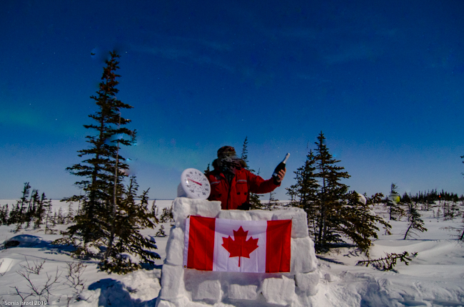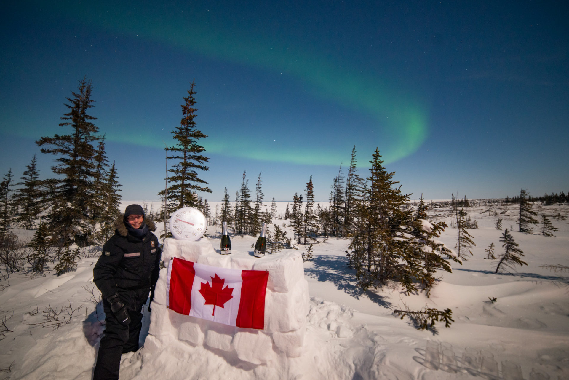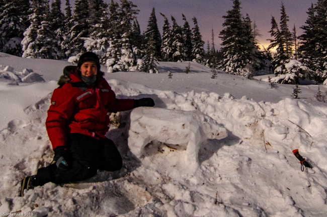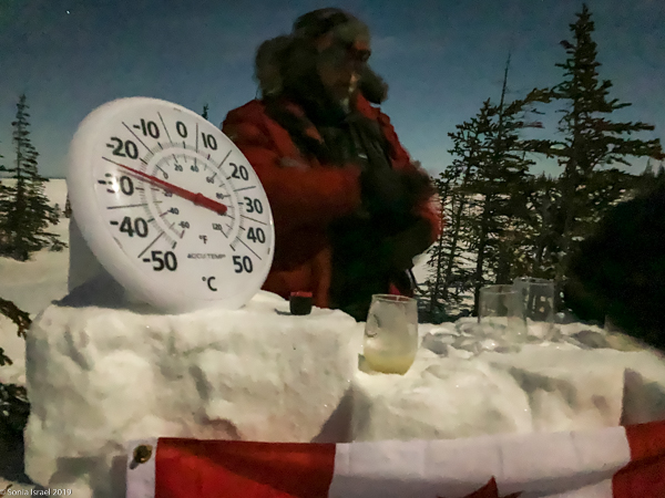 As we were standing around waiting, we noticed that Eddy and Lianne were carrying snow blocks which they cut out of the snow banks with their machetes. They wouldn’t tell us what they were building. Turned out to be an ice bar with a thermometer on it and some bottles of champagne.  Very cold champagne!