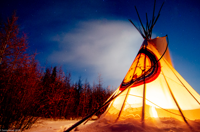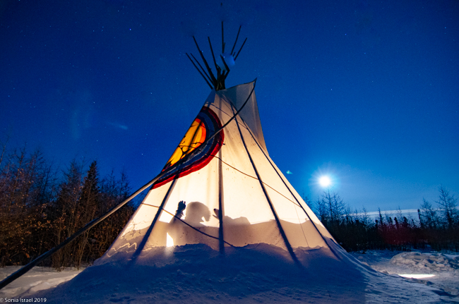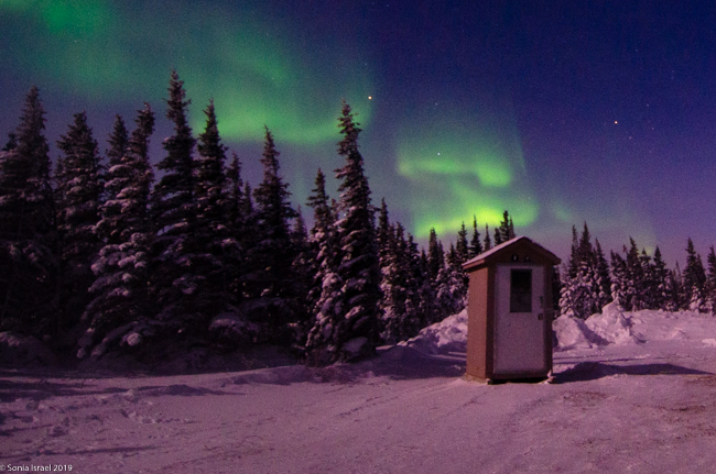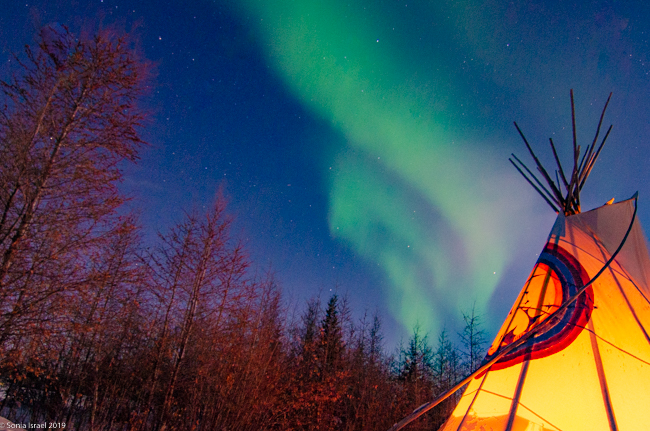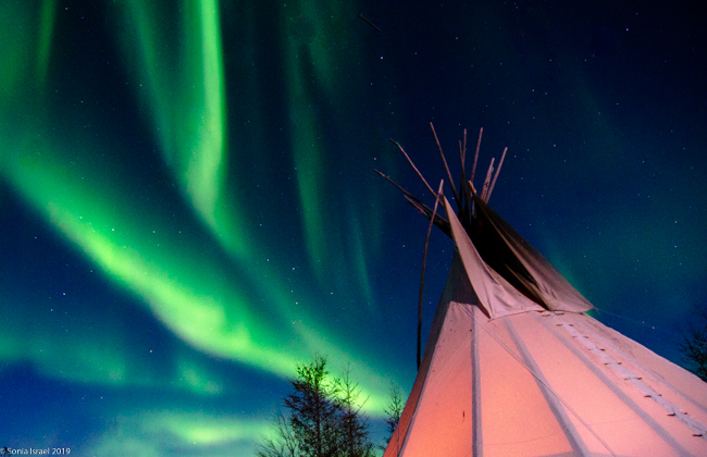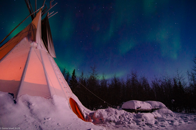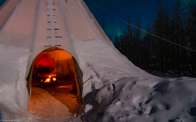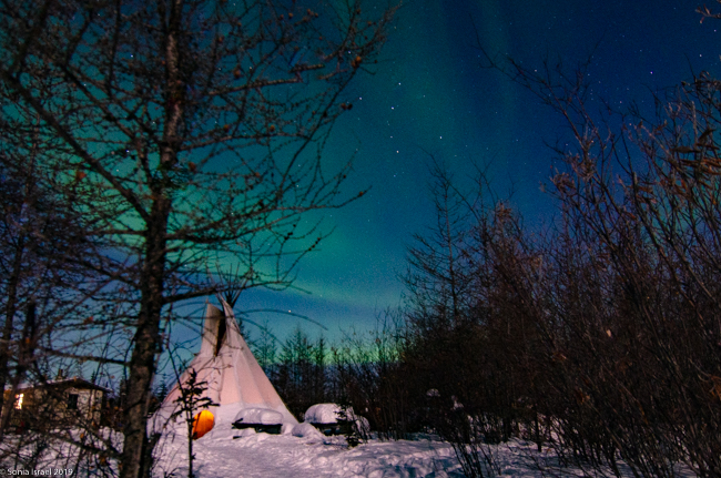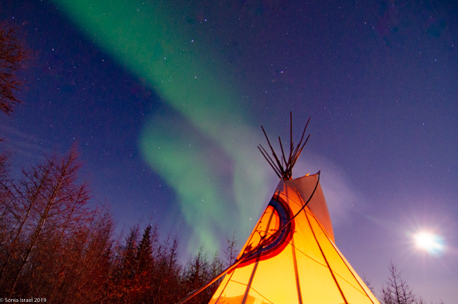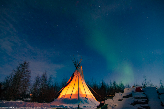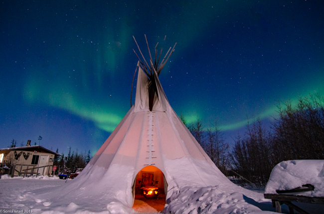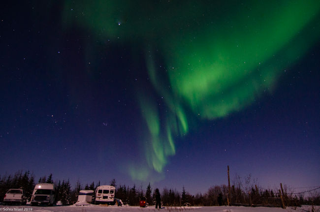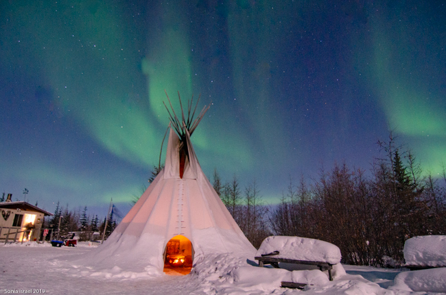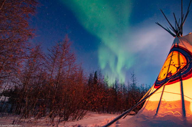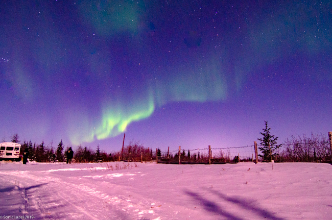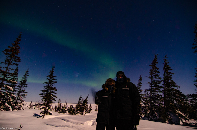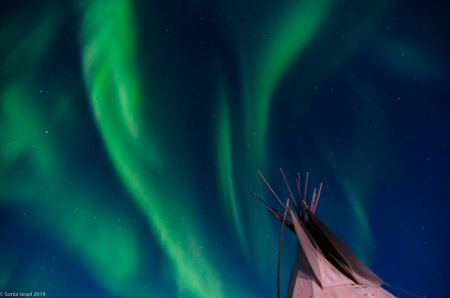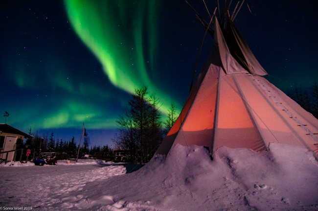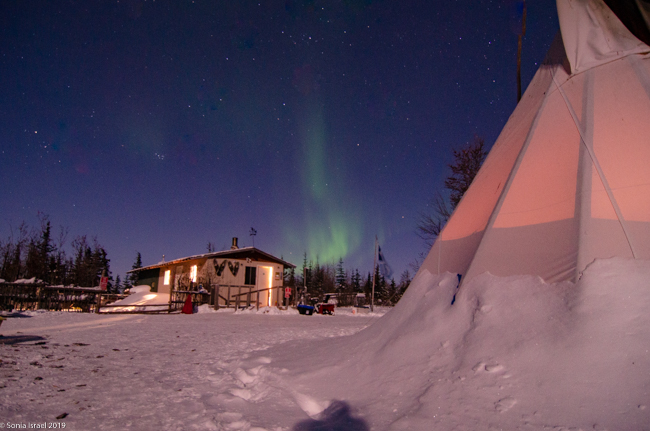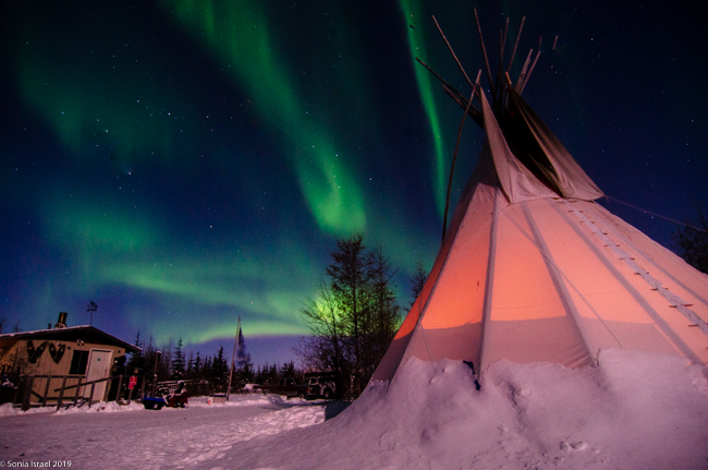 This was to be our last night in Churchill. We went to a new location, the grounds of David Daley and the Wapusk Adventures. We had visited Dave Daley on Tuesday to go dog sledding (please see post on Churchill for more info on David Daley and our dog sledding experience). Dave has this large, fabulous tepee on his grounds which made for a great background for pictures. And this is where we headed tonight.