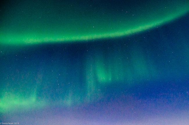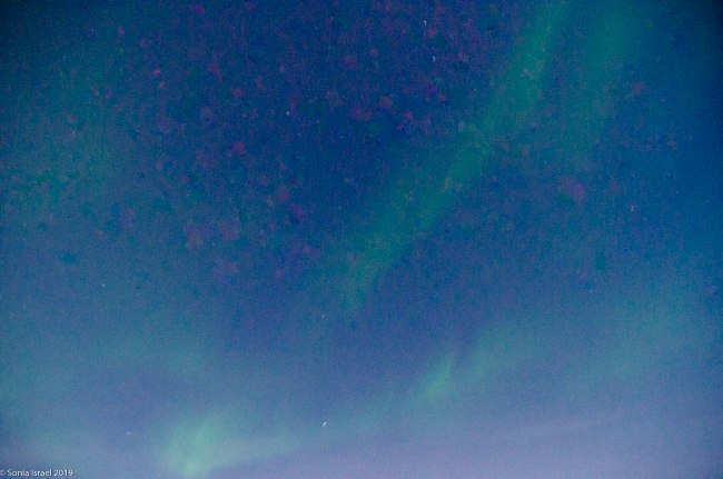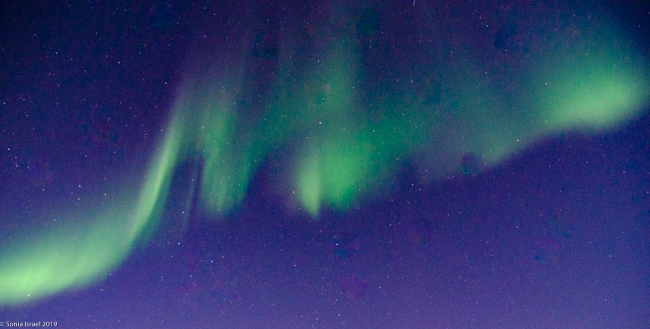 At about 12:30am, when there had been no more lights, we decided we had had a good first night. We all piled into the bus. We took our cameras off our tripods. We cleaned off the frost and dried them. And then we put them back in our backpacks to protect the lens as we entered the warm bus. And we headed back to town. In about 4 minutes Eddy shouted, “Stop the bus. Everyone out!”  The sky had burst into color again. And this time I could see the colors. Stronger. Longer. Bigger. Green. Purple. Lines. Waves.  Movement. Dancing and moving. Rippling. Twirling.  It took my breath away.  And I just shot picture after picture, holding the camera against my body to try to keep it still.