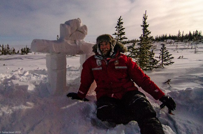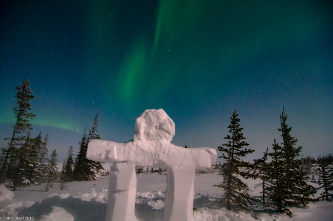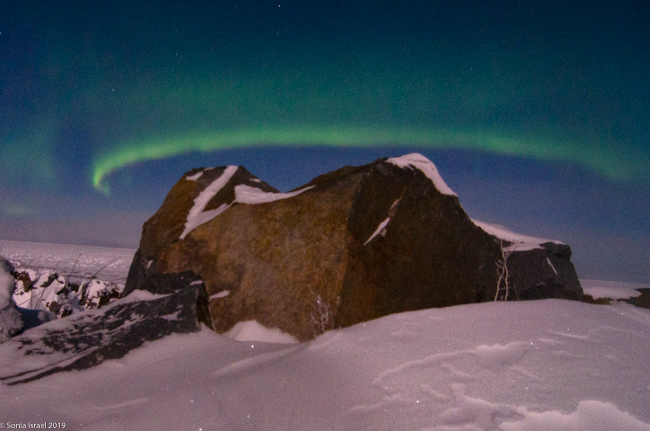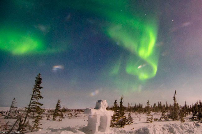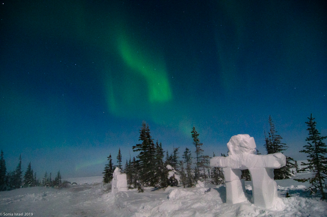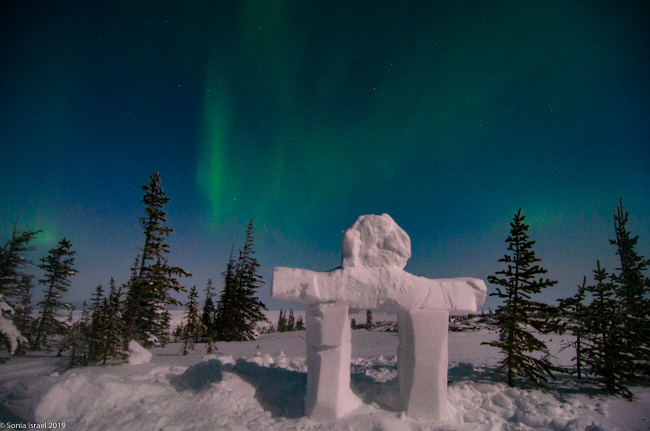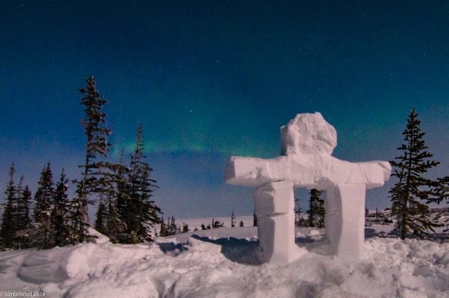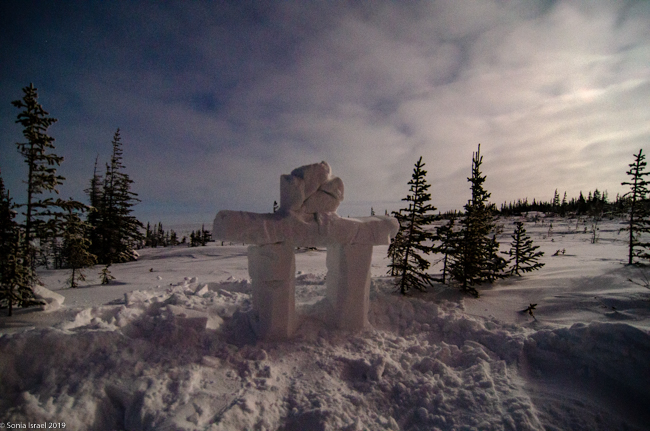 We returned to the Aurora Pod on our third night. All layered up. The moon was still full (or very close). Cameras set up. And we waited.  And waited. This time, Lianne, our guide in training, carved a polar bear and Eddy built a inuksuk.  An inuksuk?  Yes. An inuksuk is a figure made of piled stones used to communicate. These are found throughout the Arctic where there are few natural landmarks. (To read more about the inuksuk, and to see pictures, please see the blog on Churchill, Canada).