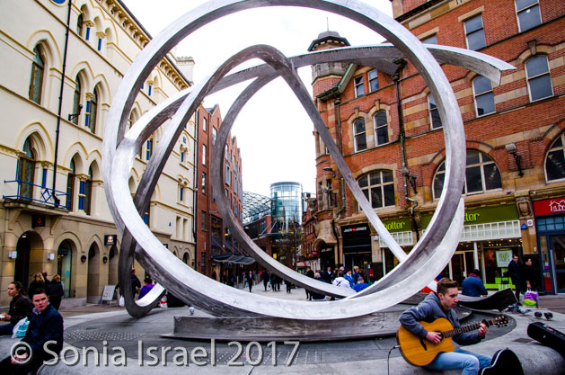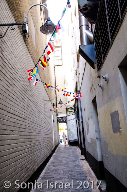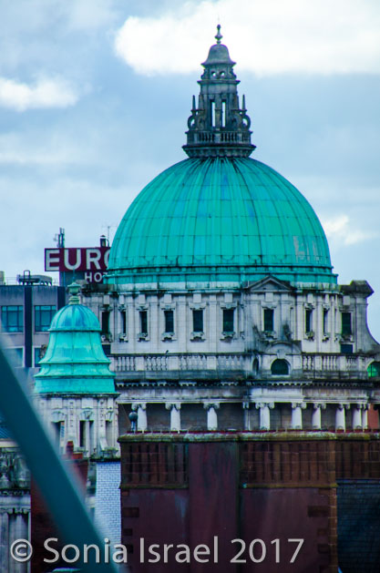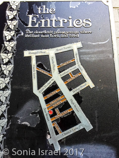 We walked through the little alleys and passage ways, known as the entries. These are a series of historical, narrow alleyways connecting the larger streets, mostly in the area of High Street and Ann Street. Dating back to at least 1630 but most probably even earlier than that, these entries are the oldest parts of Belfast city. The narrow alley was crisscrossed in little flags. And there was a plaque explaining that “The entries were narrow streets and arcades that connected the main shopping areas in the center of Belfast. From the 17th century to today, they are linked with the social and economic growth of the city. In the 18th century, High Street had a prominent Market House which was the hub of the commercial life in Belfast. Merchants, shopkeepers and traders congregated in busy groups along the street in the open air and bought, sold or bargained their way into financial success or obscurity.” Before long they spilled over into these passage ways which became the center of commerce. They are also described as the close knit passage ways where Belfast was born and bred. They have been described as “where Belfast began and developed into the city it is today”.