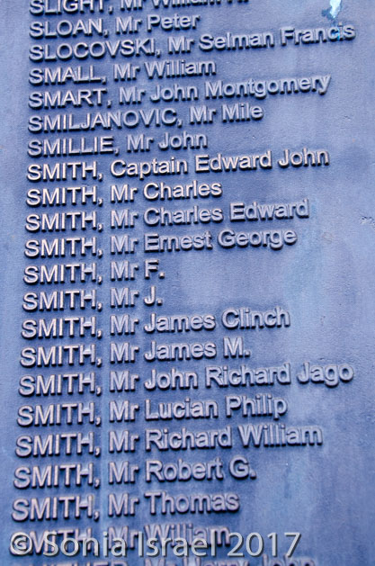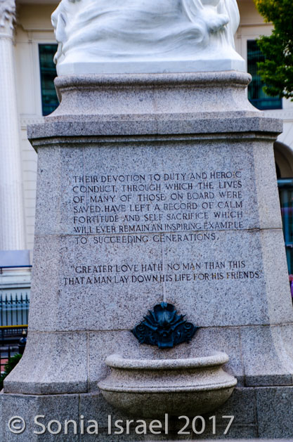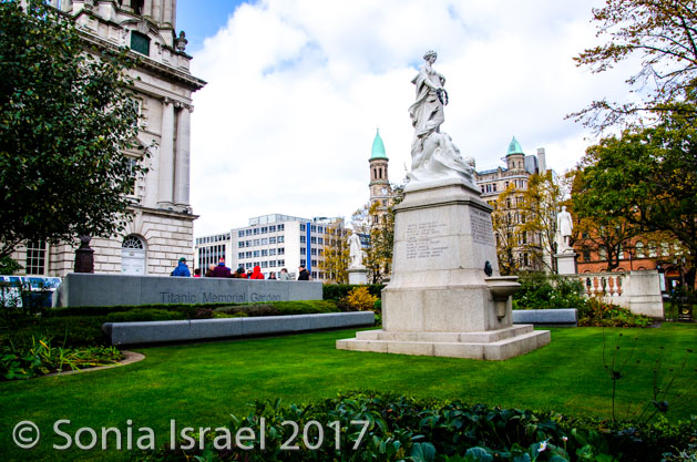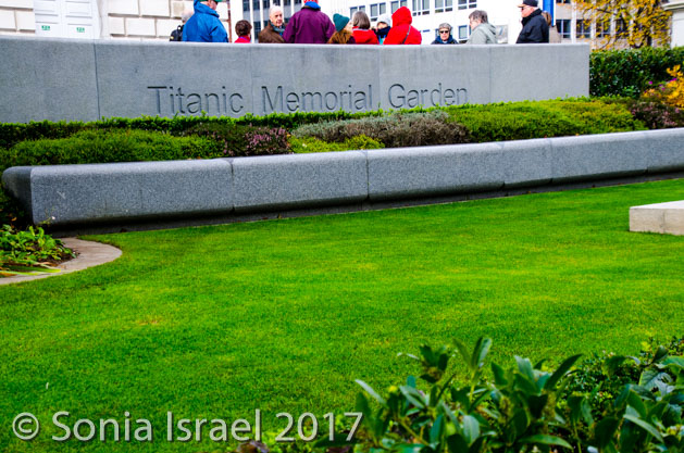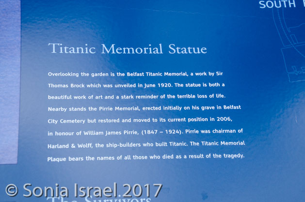 In the garden, along with all the statues, is the Titanic Memorial Garden and Titanic monument. The Titanic garden is set on two levels with the upper level containing a long wall with 15 bronze plaques which list, in alphabetical order, the names of 1,512 people who perished on the Titanic. This is the first time that the names of everyone who perished have been recorded on one monument. ‘The Belfast List’, as it is now known, is a key feature of the memorial garden. It is dedicated to those whose “devotion to duty and heroic conduct, through which the lives of many of those on board were saved, have left a record of calm fortitude and self-sacrifice which will ever remain an inspiring example to succeeding generations. ‘Greater love hath no man than this, that a man lay down his life for his friends’.”