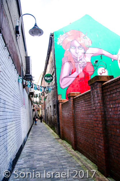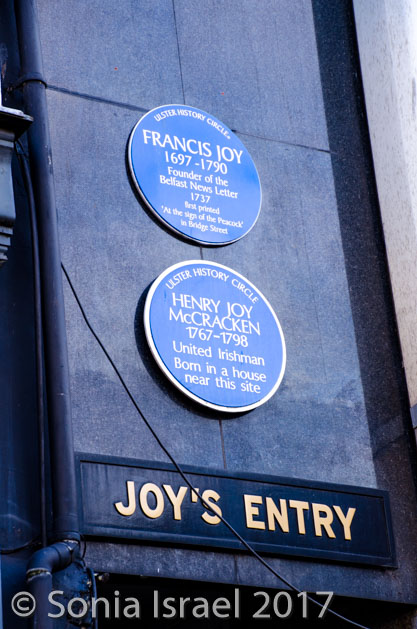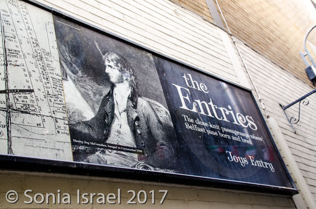 One in particular was Joy’s Entry (named after Francis Joy, founder of the first Belfast newspaper). There was a large mural at the entrance, of a woman cautioning secrecy (“shhh”) as she pulls back a curtain to reveal a keyhole in the wall, the key for which is on a chain around her neck. The mural is called The Gatekeeper (by an artist named Friz) and there was much more to her story, but I can’t remember it and I can’t find it.