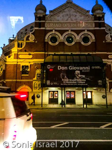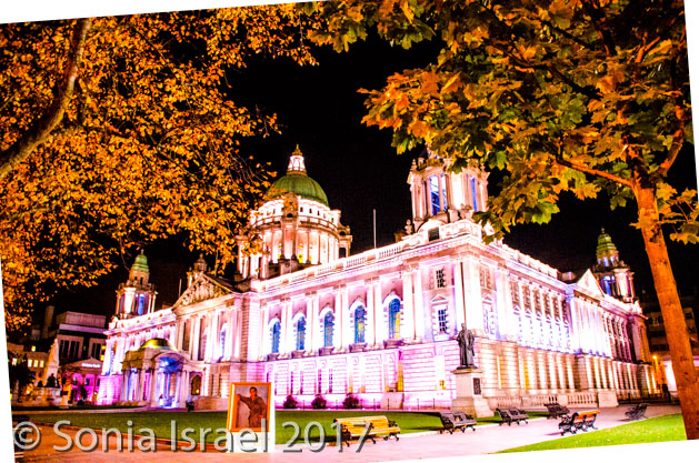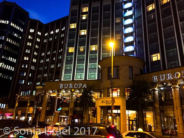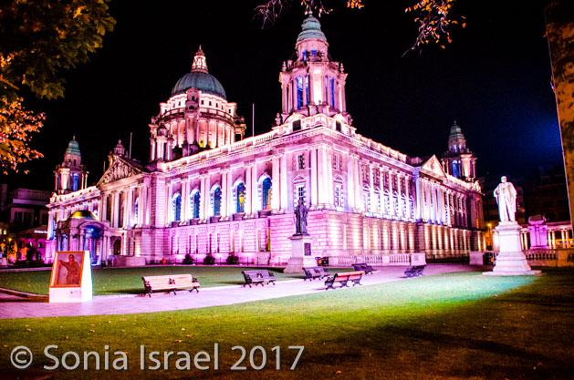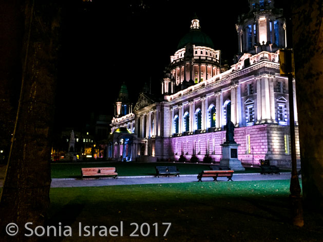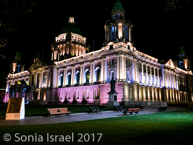 After breakfast, we grabbed our jackets and gloves and hats (yes, it was cold!) and our green audio boxes and boarded the bus for our tour of Belfast. We drove through the town, past the Europa Hotel which, as four-star hotel,has hosted presidents, prime ministers and celebrities. But during the Troubles (see below) it became known as Europe’s most bombed hotel (yes these pictures are at night and we were there in the morning, but obviously again later that day). We also passed the Belfast Opera House.