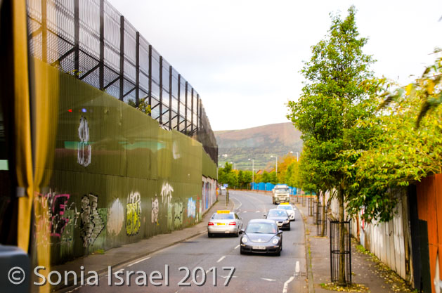 We drove past the wall of murals and then to the peace wall. We would be returning here later so I’ll save the description. But in short the Wall of Murals depicted the past and present political and religious divisions of Ireland, and of the world. And the Peace Wall is one of the walls that was built to separate the Irish Catholic neighborhoods from the Protestant neighborhoods and are now covered with “graffiti” with slogans and signatures for peace.  At the Peace Wall we got out and wrote a message.