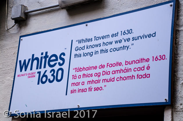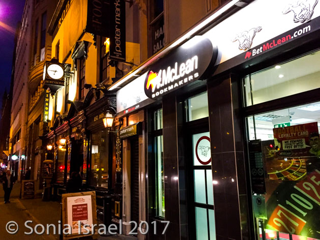 We also strolled down the Winecellar Entry which widened in the middle into a courtyard with a famous pub at one end, Whites, established in 1630 (with a quote, “God knows how we survived this long in this country) and next door a bookmaker. This is very common to see one next door to the other. Men would come in for a pint, go next door to place a bet and then, if they won, come back for another pint.