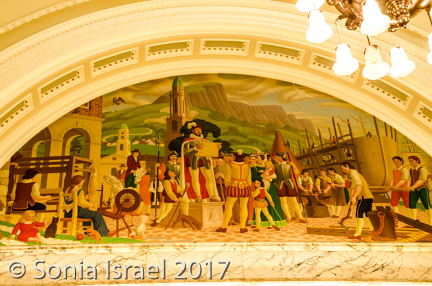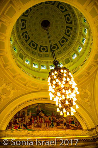 Tours of the building last about one hour, are free and are on a first-come basis.  We got our tickets and joined a group of about 20 to learn the history and see the sights. The building itself has four towers, one at each corner, and a lantern-crowned copper dome in the center. At night it is lit up in a variety of colors from the flood lights below and we made sure to come back later that night to see it in its lit-up glory. But that comes later.