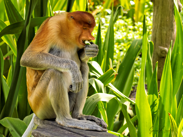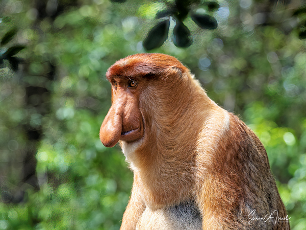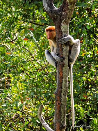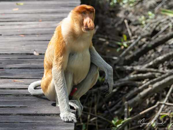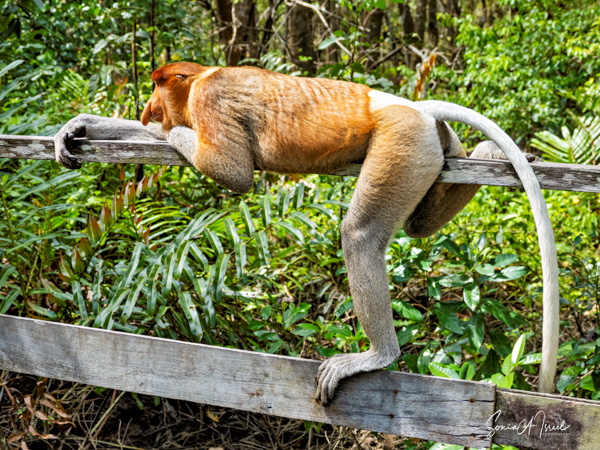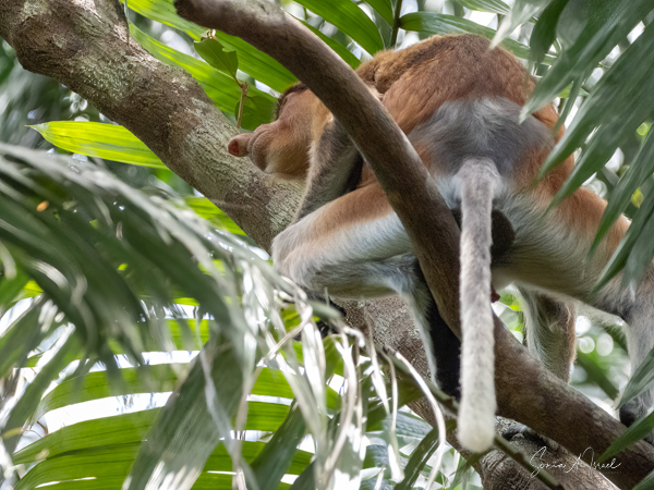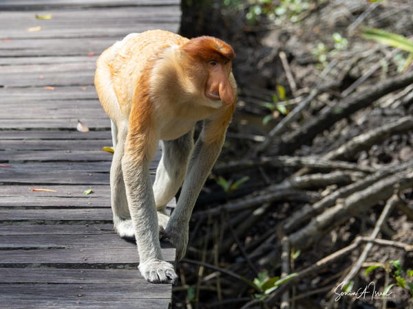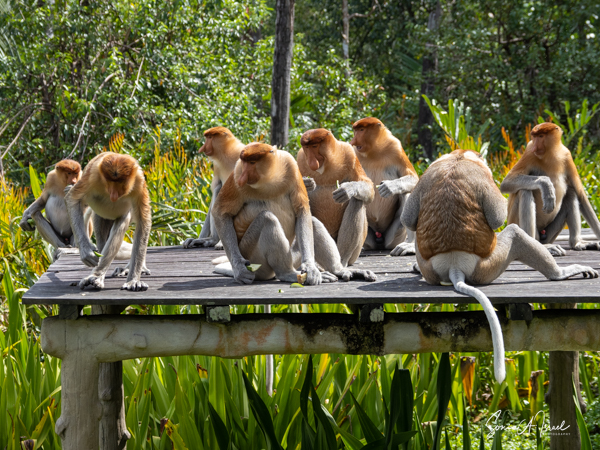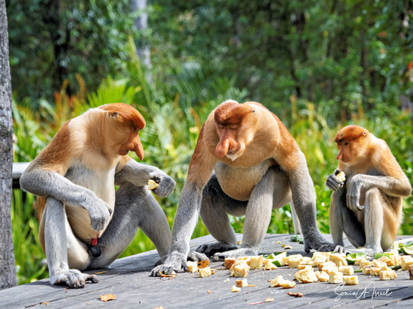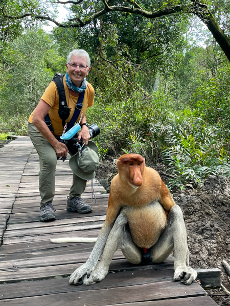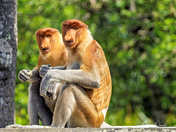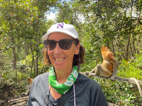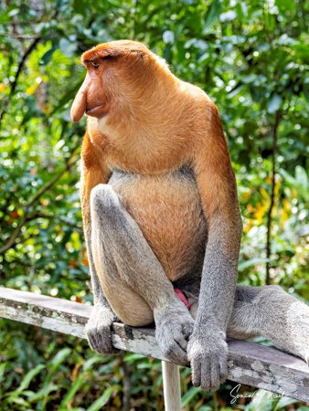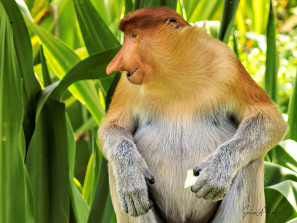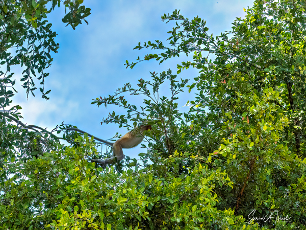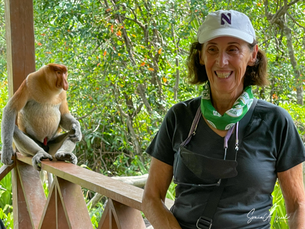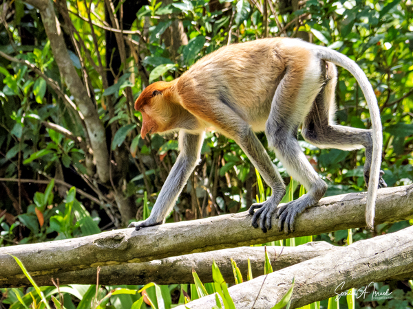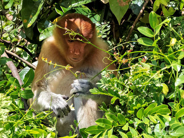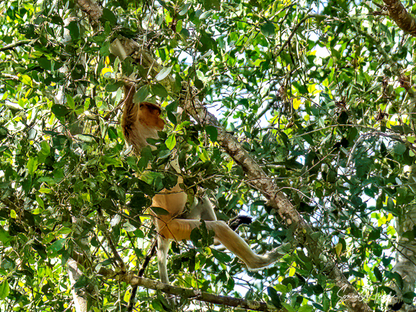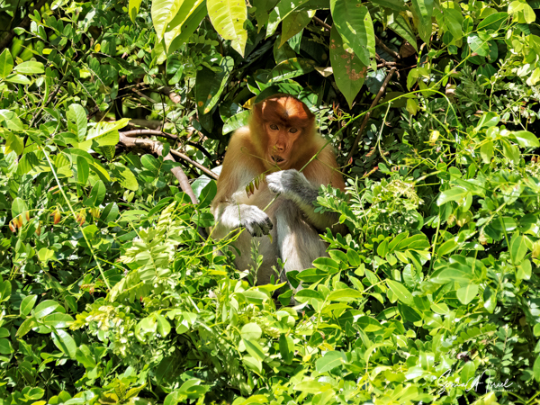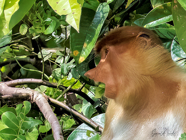 The proboscis monkey (Nasalis larvatus) is also called the long-nosed monkey, because, of course, the males have a very, very large and long nose (note the females have small noses)! It can only be found Borneo and is one of the reasons Ruthi and I wanted to travel here.
