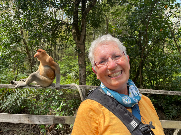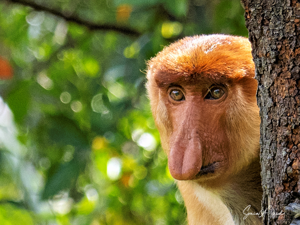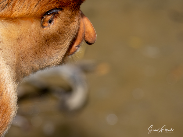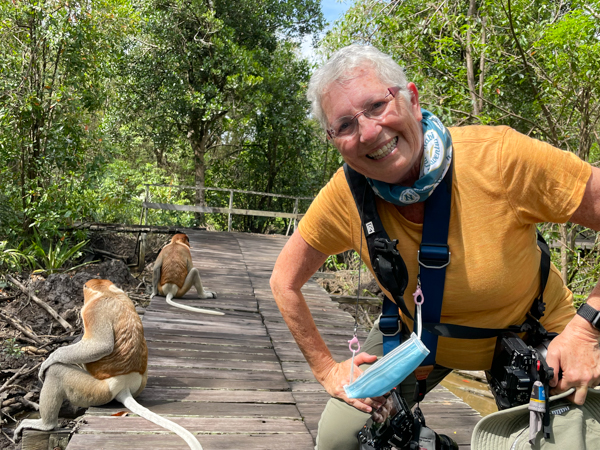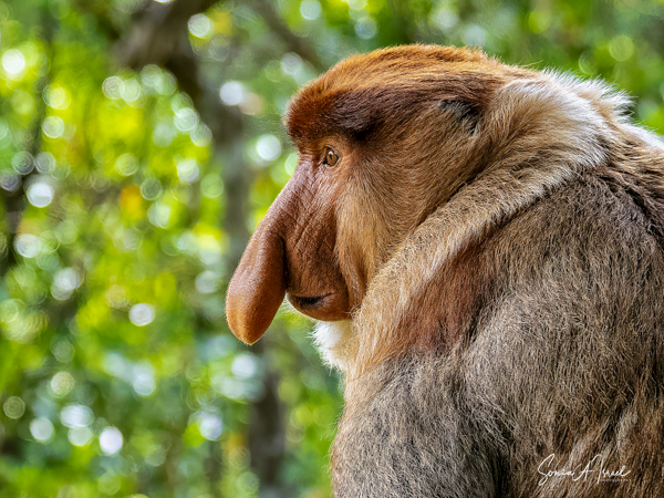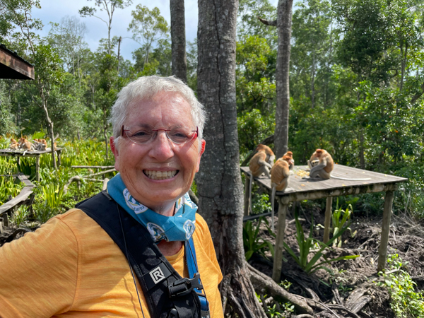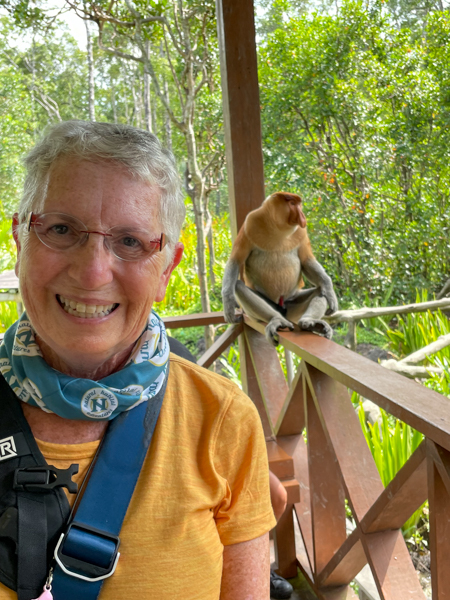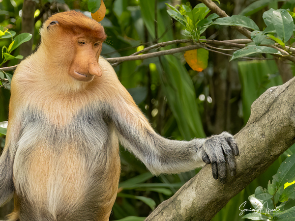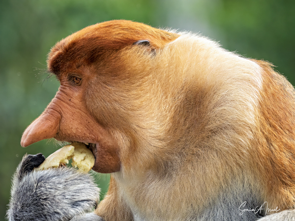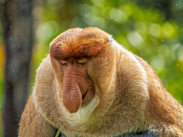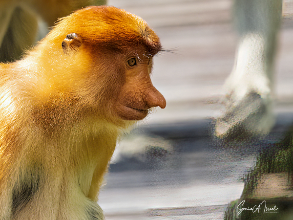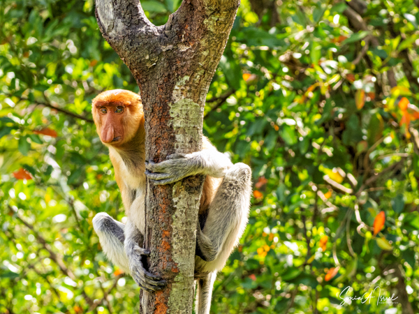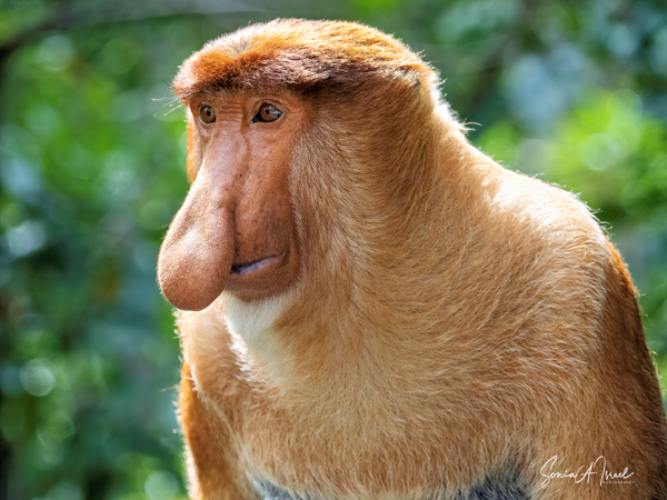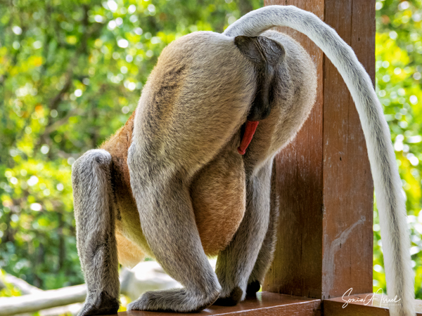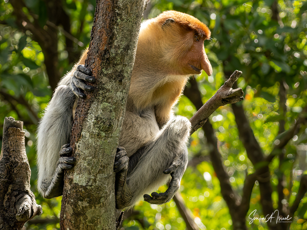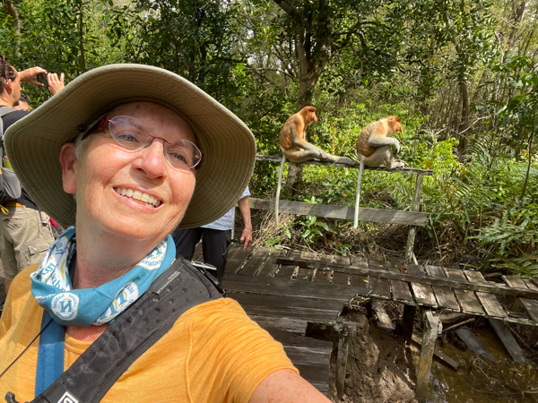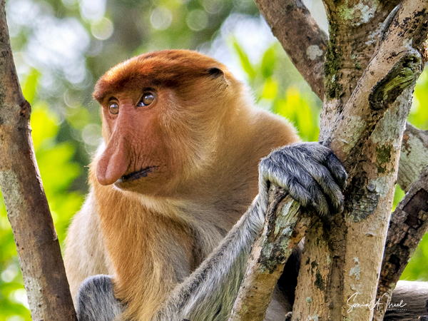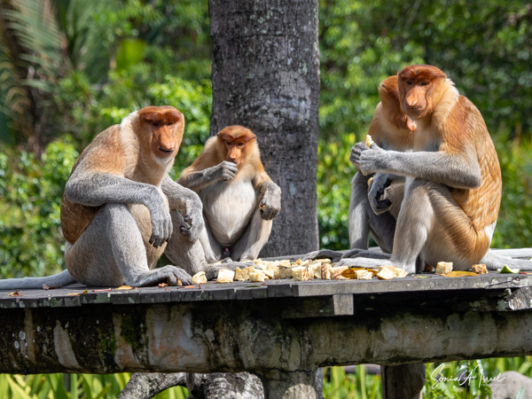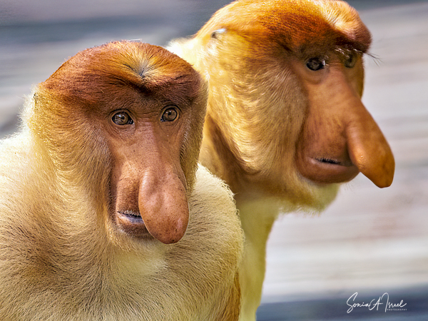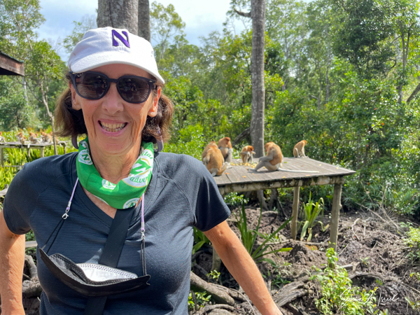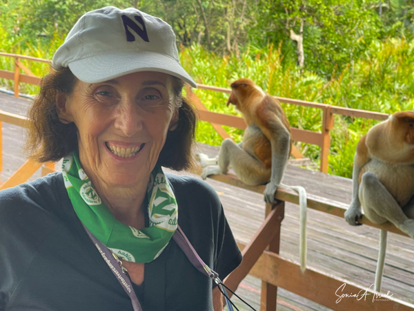 The proboscis monkey (Nasalis larvatus) is also called the long-nosed monkey, because, of course, the males have a very, very large and long nose (note the females have small noses)! It can only be found Borneo and is one of the reasons Ruthi and I wanted to travel here.