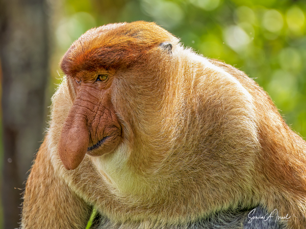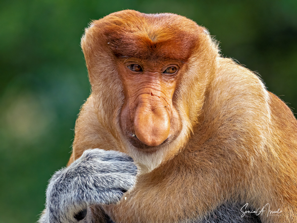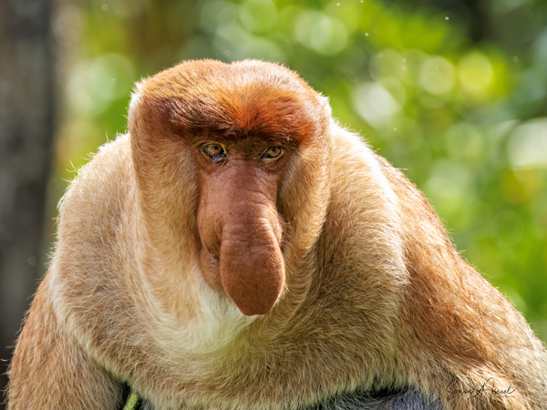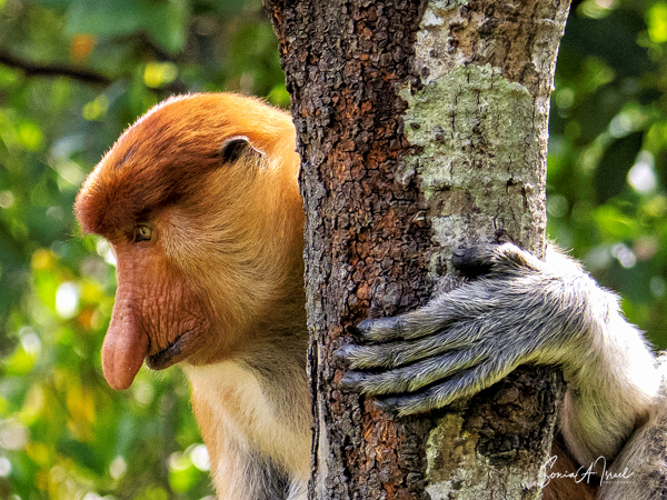 So, why did the proboscis monkey develop this large nose which can be four inches long? This large organ creates an echo chamber that amplifies the monkey’s call and that call impresses the females and at the same time it intimidates the other males.