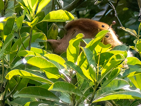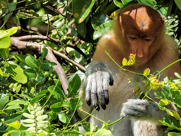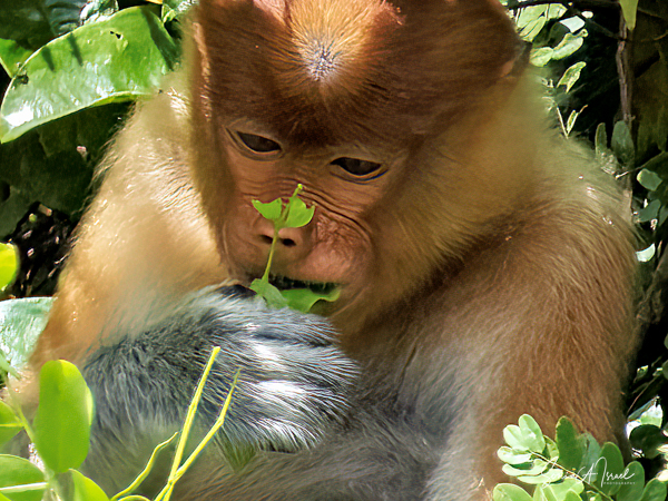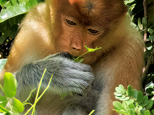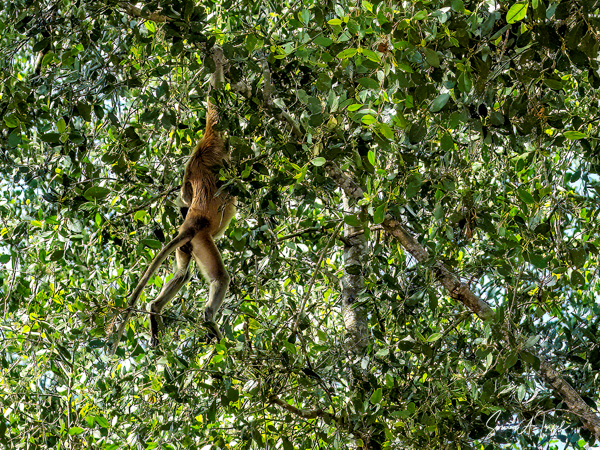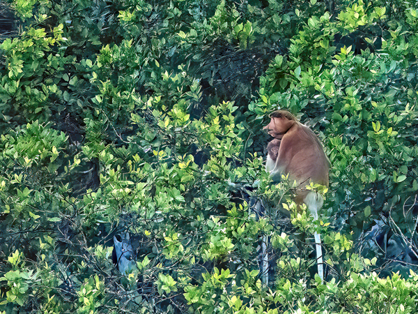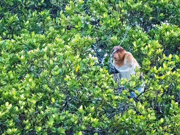 A few days later, as we floated down the Kinabatangan River, we saw a female proboscis monkey up in a tree, eating leaves just as she was supposed to.