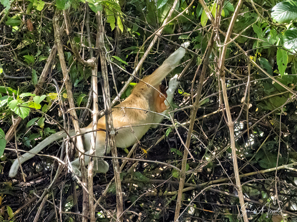 The proboscis monkeys hang out in mangrove forests and the coastal areas of Borneo, never far from the water. Often they will congregate near the water at night to sleep. Within the primate world, they are the most prolific swimmers. While we never saw this, they often leap from the trees and hit the water with a belly flop. Because of their love of swimming, they developed webbed hands and feet which help them swim fast, like the flippers that divers wear, and this helps them out-swim their main predators, the crocodiles found in these waters (of which we saw quite a few).