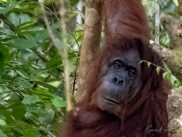 Orangutans are known for their distinctive red fur. They spend most of their time in trees which makes them easier to spot against the foliage. They have long, very powerful arms and they use their hands to grasp and swing through the branches.