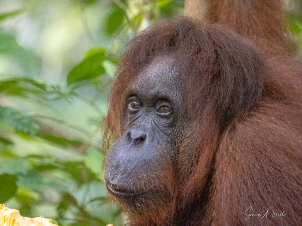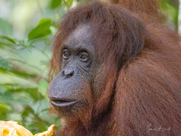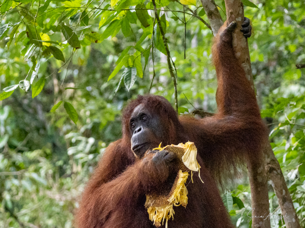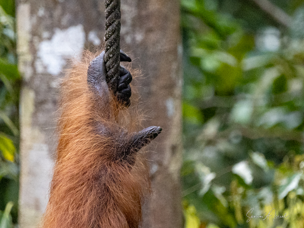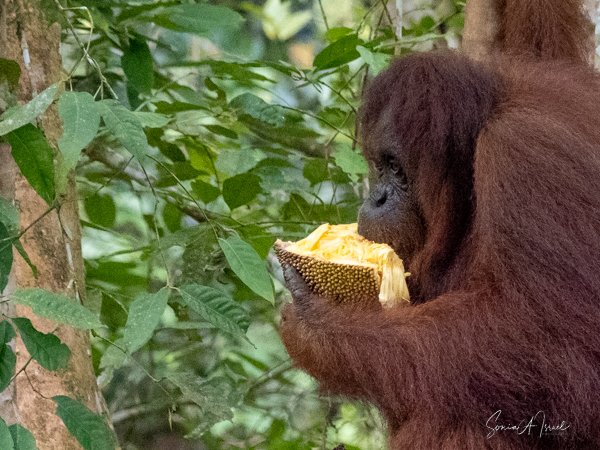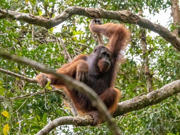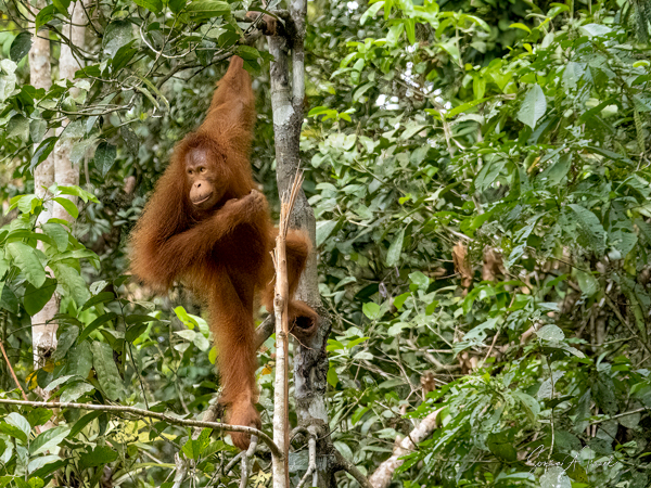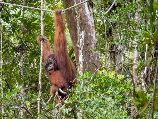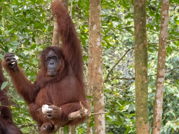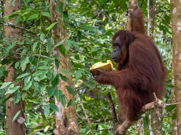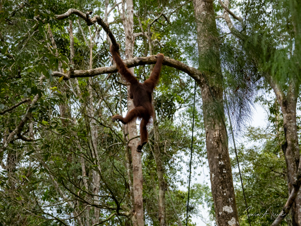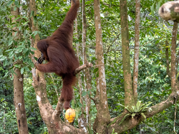 And then over on the other side, we noticed a teenager who was a bright, bright orange and the younger orangutans tend to be. He was climbing down a tall tree heading for the food. And boy was he beautiful.