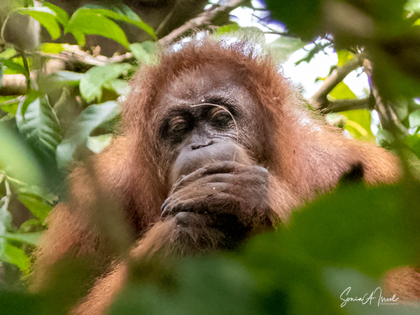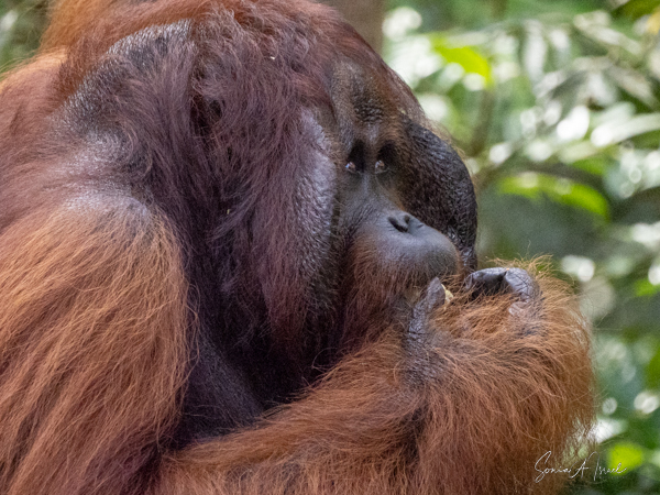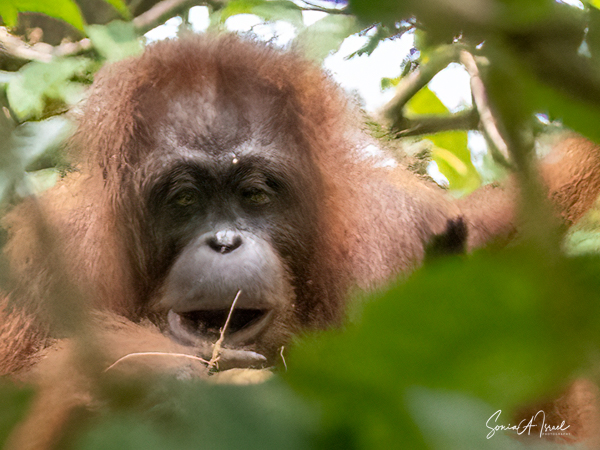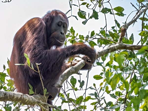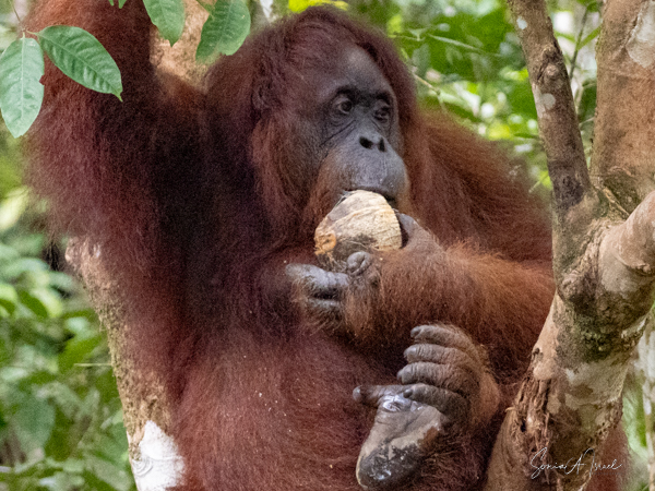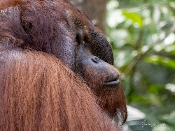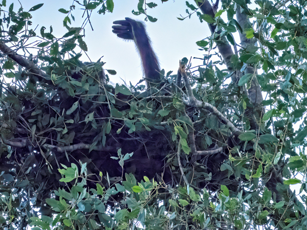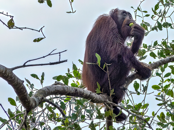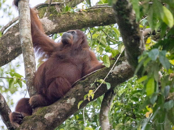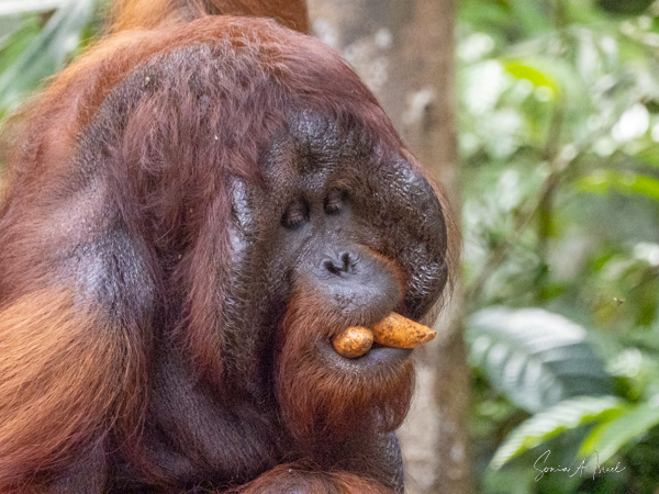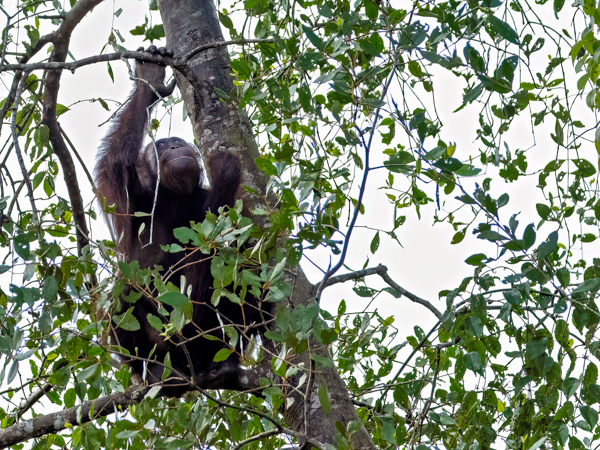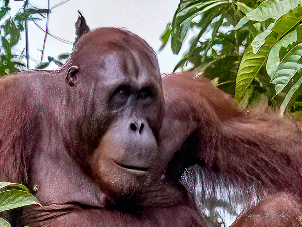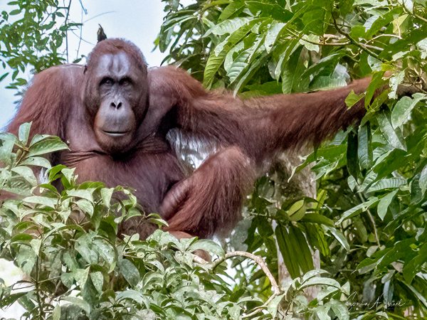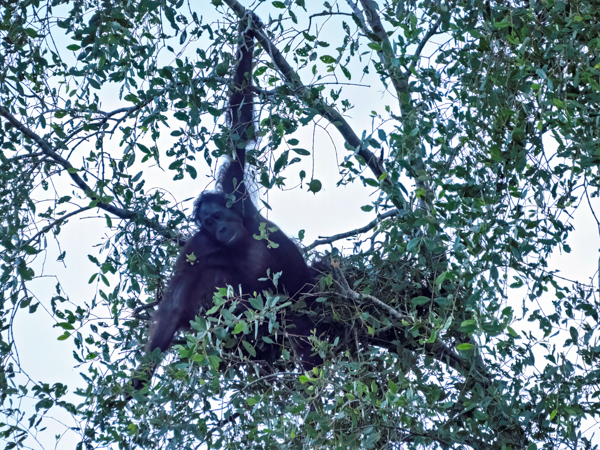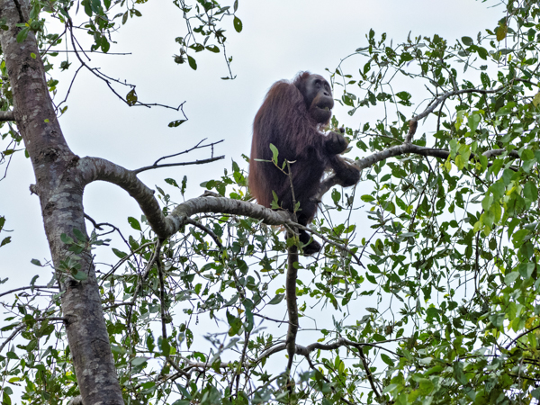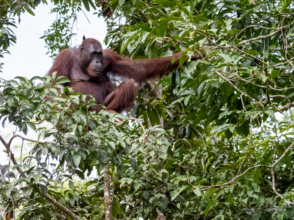 We stayed about two hours, just watching and watching them. This was my first sighting of an orangutan in the wild, or at least not in a zoo. We would see more later, some really in the wild, but, as they say, there is nothing like that first time. What a magnificent creature. The males indeed could be identified by their flanges. And that red fur! What a color. Beautiful.