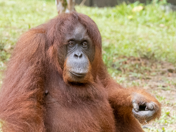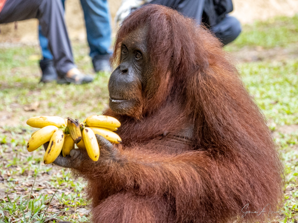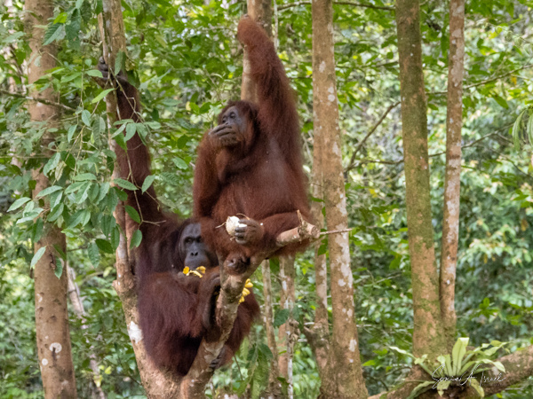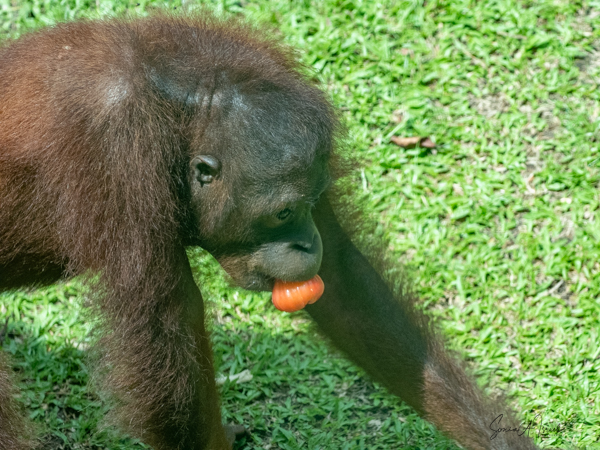 Some of the caregivers were handing out coconuts and other fruit for them to eat. And then more and more orangutans came forward. While there are 26 orangutans in the sanctuary, we saw six: Anuar-Alfa male, age 26, Suduku-Female age 51 (called the grandma because she is one), Ganyah-Male, age 14, Anakku-Male, age 16, Ruby -Female, age 9, and Jubli -Male, age 9.