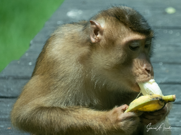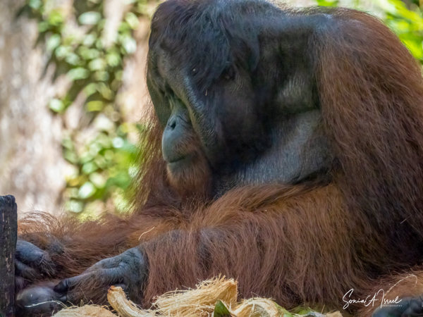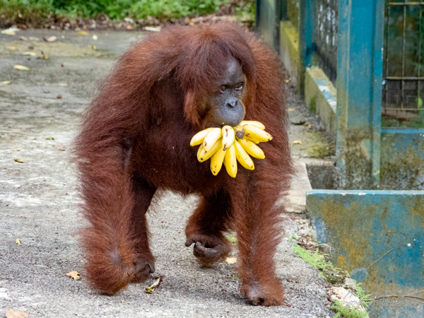 One of them had lost an eye, likely in a fight, but seemed to do just fine. And then, the caregiver said, “Everyone move back.” As I mentioned above, one of the orangutans decided to come down and walk amongst us. He carried a bunch of bananas in his mouth, found a spot, and just sat down to eat, totally oblivious to all of us staring and photographing him.