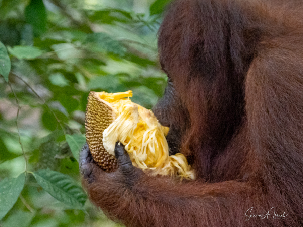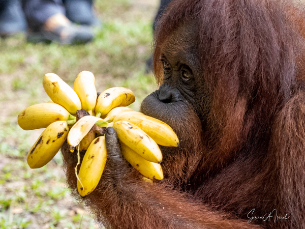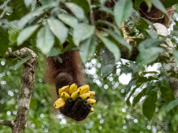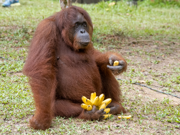 Unlike other great apes, orangutans rarely come down to the ground where they are more cumbersome. But when they do, they walk by bending their digits and walking on the sides of their hands and feet, unlike other apes who walk on their knuckles. We got to see one walk right by us, carrying his stalk of bananas. I wasn’t afraid at all. He ignored me (and all the rest of us standing around) and we just watched in awe (see below for the pictures).