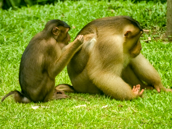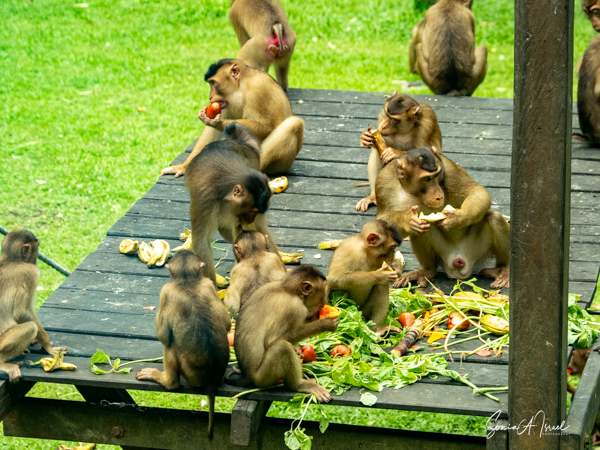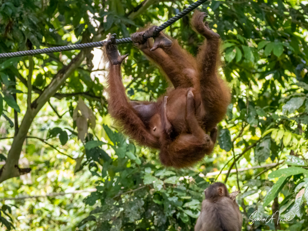 We again watched for a while before making our way along the walkways to a building with large glass windows behind which we watched orphaned orangutans, mothers and babies and of course, lots more macaque monkeys.