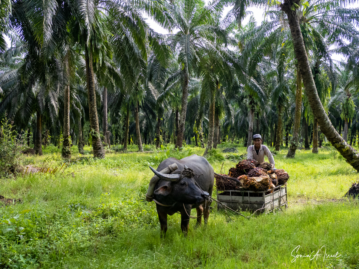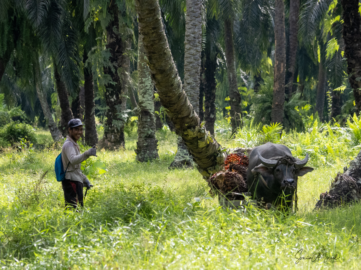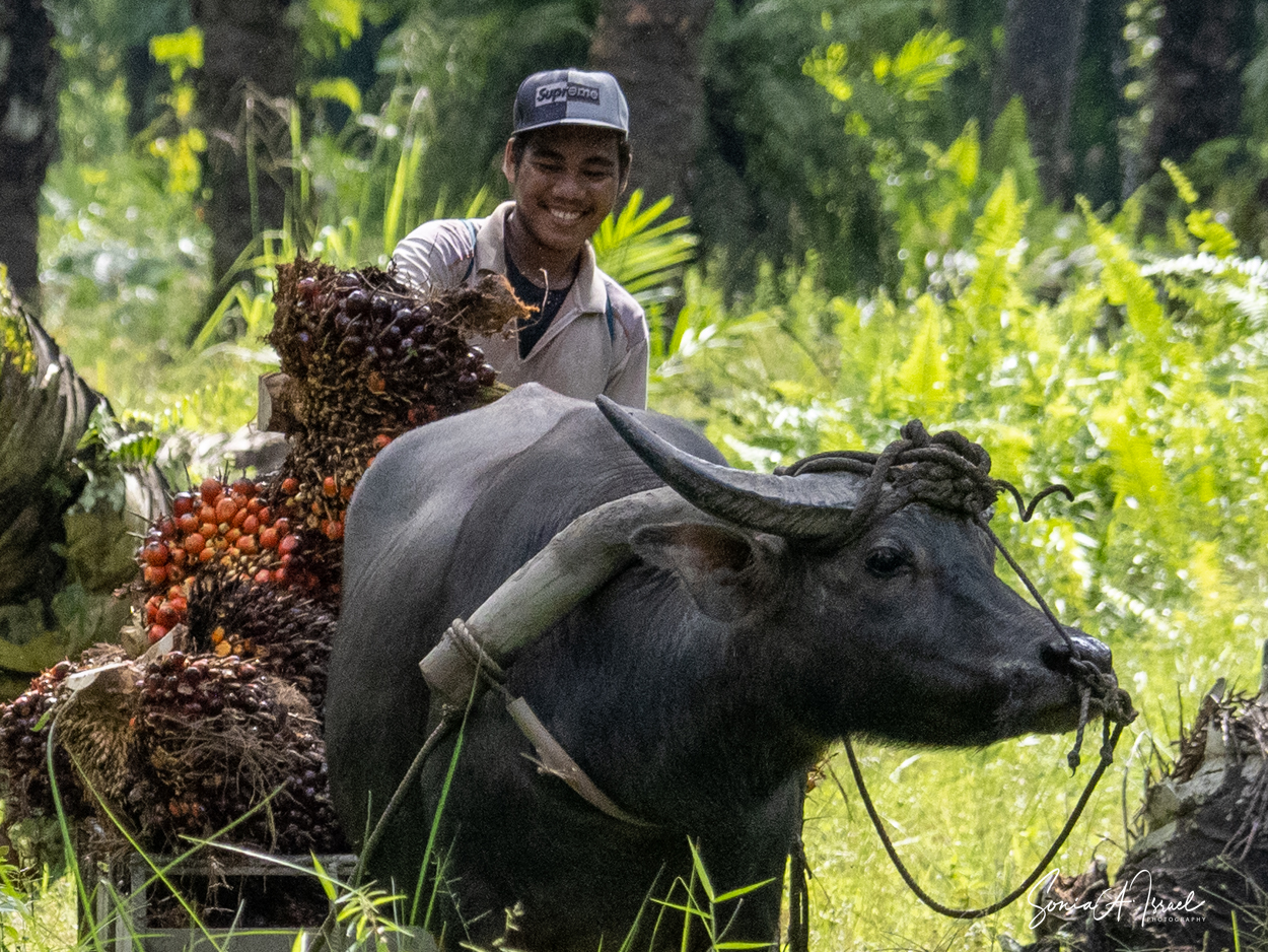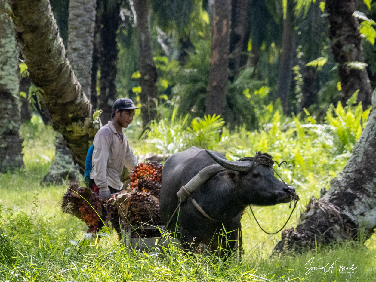 And these plantations create jobs. But the jobs are hard and pay is low. As you can see in the pictures, one man collects the fruit of the palm and using a spike, swings it onto a cart pulled by a buffalo. Then, when it reaches the truck, another man, also using something like a pitchfork, swings the fruit onto the truck. Some communities are part owners and get some money back.