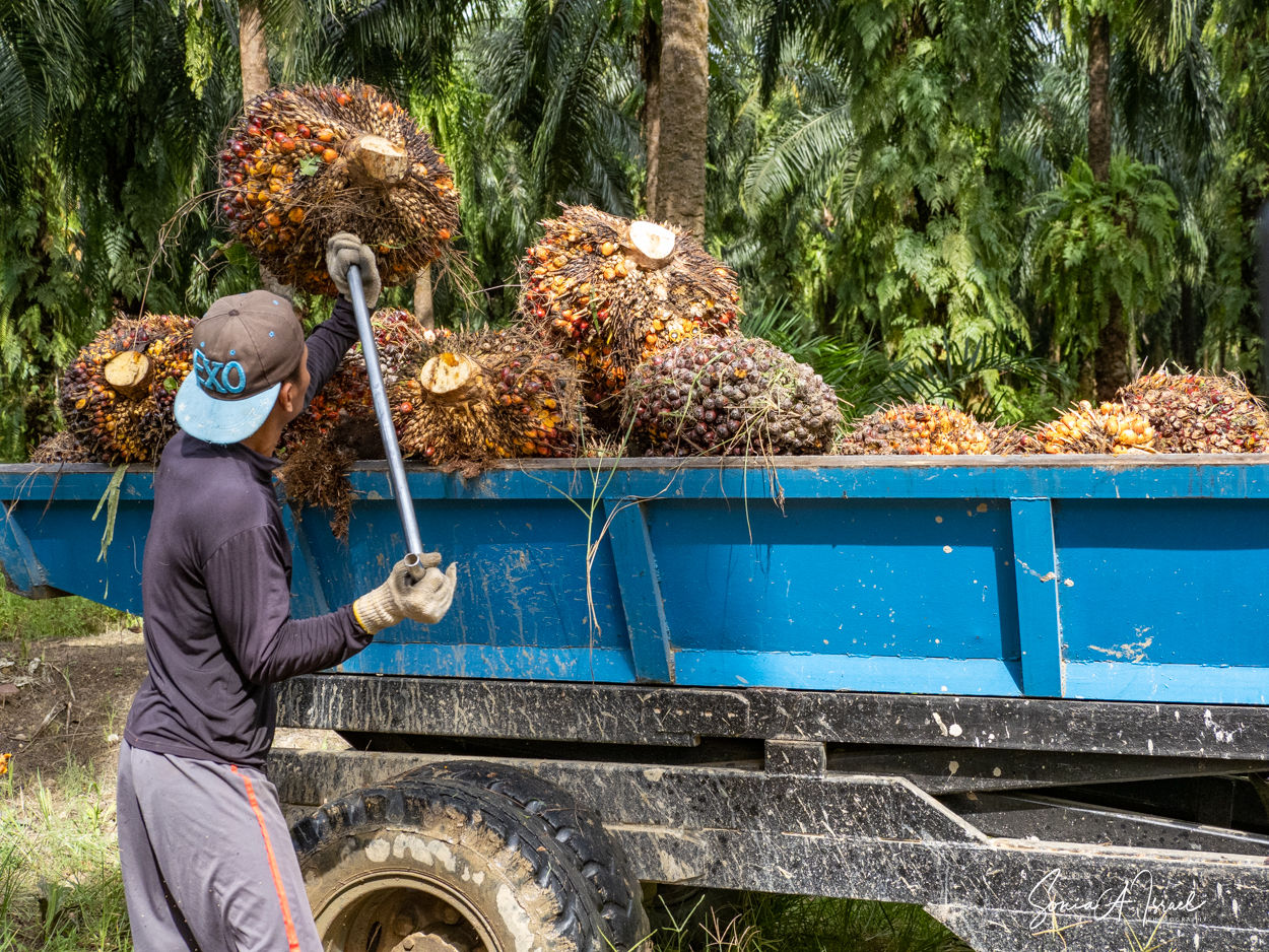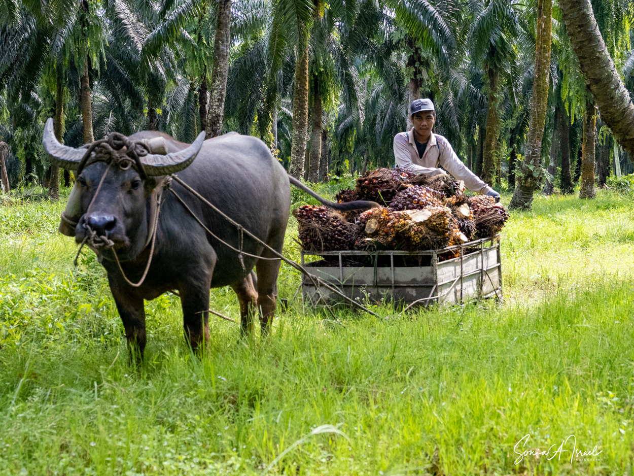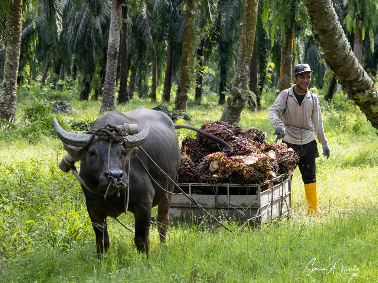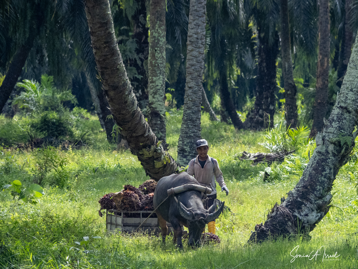And these plantations create jobs. But the jobs are hard and pay is low. As you can see in the pictures, one man collects the fruit of the palm and using a spike, swings it onto a cart pulled by a buffalo. Then, when it reaches the truck, another man, also using something like a pitchfork, swings the fruit onto the truck. Some communities are part owners and get some money back.