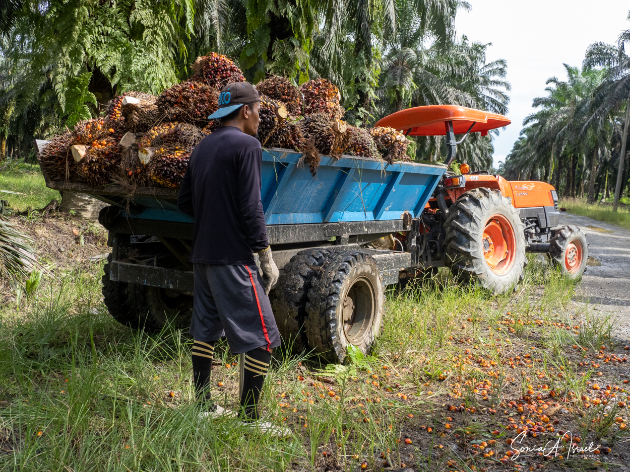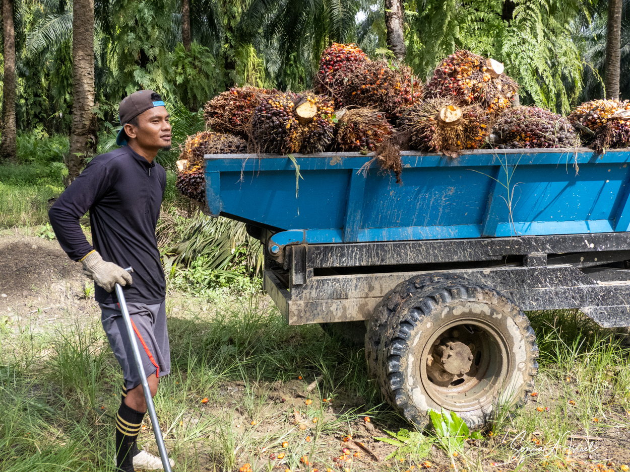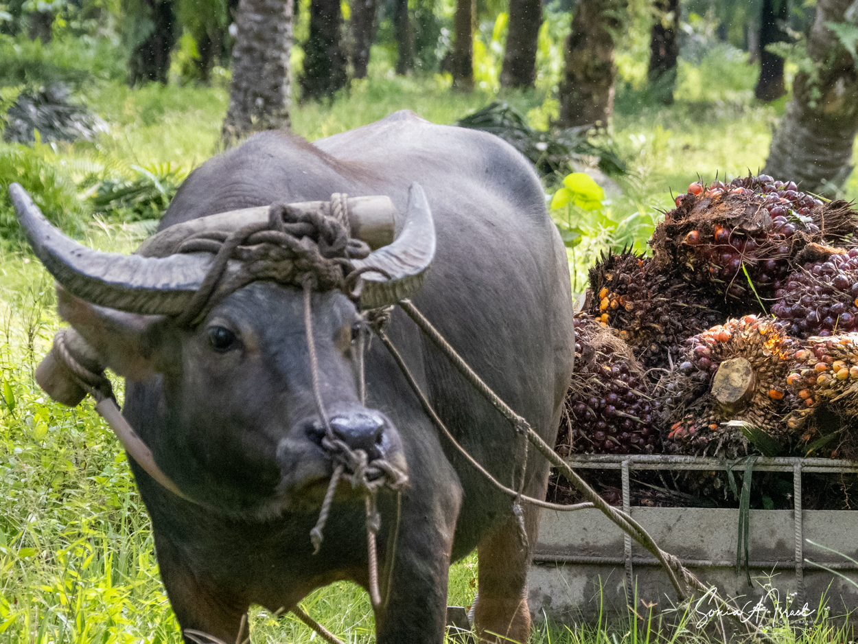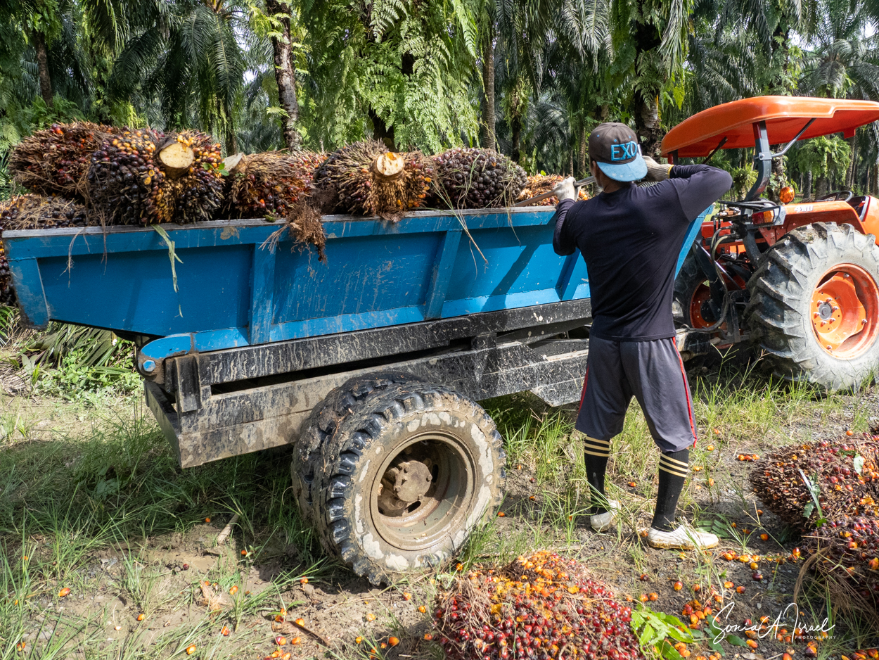 And these plantations create jobs. But the jobs are hard and pay is low. As you can see in the pictures, one man collects the fruit of the palm and using a spike, swings it onto a cart pulled by a buffalo. Then, when it reaches the truck, another man, also using something like a pitchfork, swings the fruit onto the truck. Some communities are part owners and get some money back.