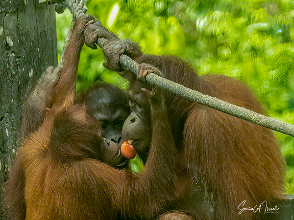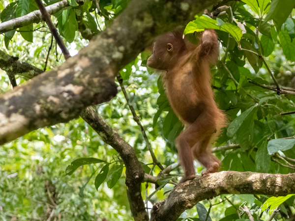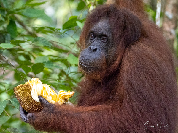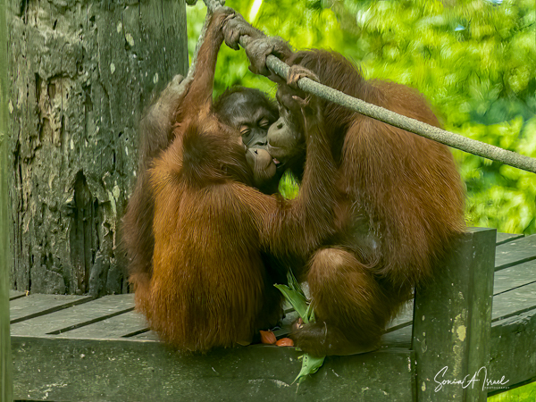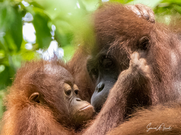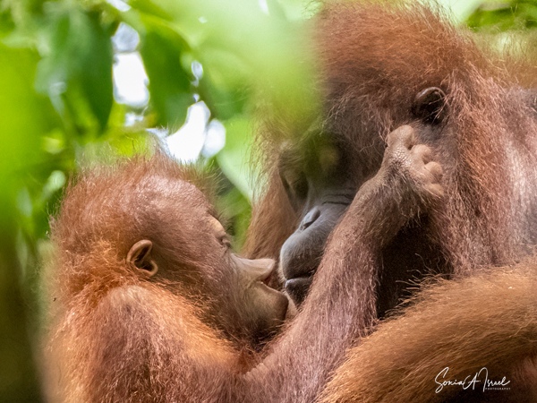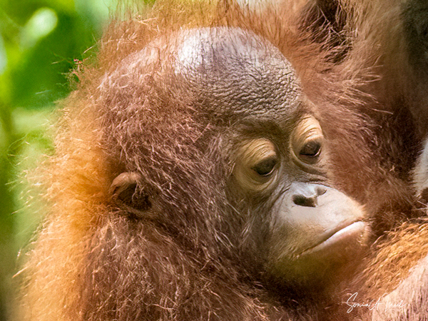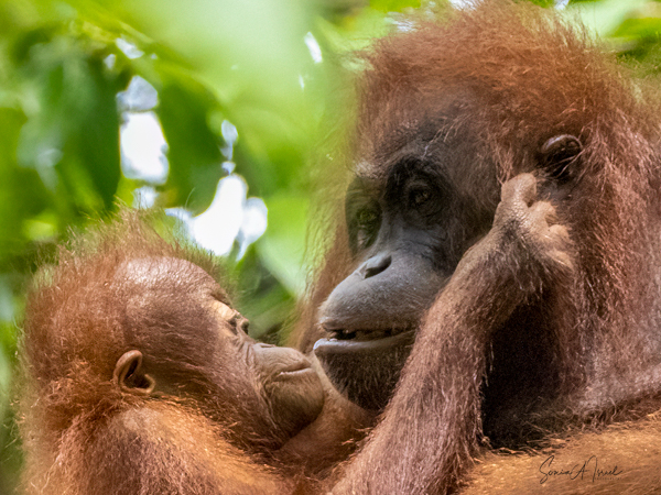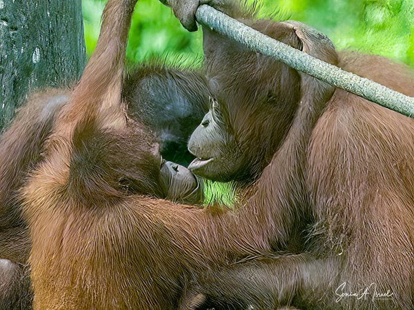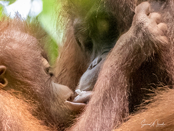 And what happens once that male attracts a female? She can start having offspring at about age 15 with 6-9 years between births. During this time, she tends to avoid the males. The females take care of their young, carrying it while traveling, suckling and sleeping with it. During the first four months, the two are in constant physical contact, with the infant clinging to its mother’s belly. At about age 2, the young one begins to move away from its mother, traveling through the canopy holding hands with other orangutans, called “buddy travel.” They may travel away from their mom temporarily, but always return until about age 6 or 7.
