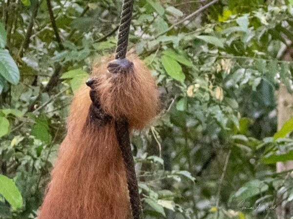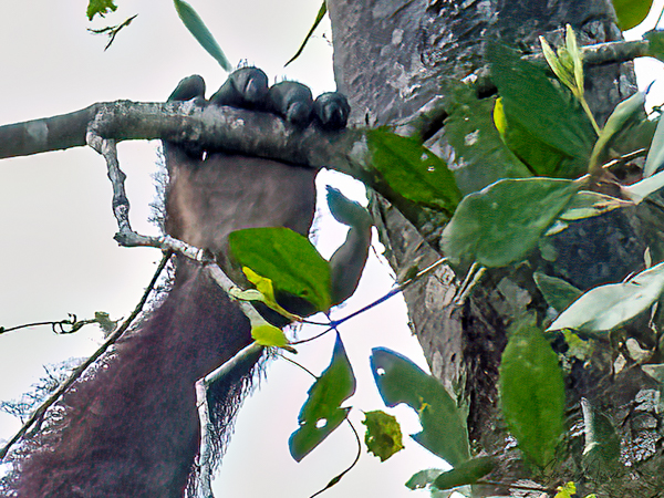 Their hands are very interesting, with four long fingers and a much, much shorter opposable thumb. This allows them to have a strong grip on the branches as they “fly” from tree to tree. And we saw them swing through the trees and it was really did look like they were flying. When at rest, their fingers are curved which makes them look like a hook. Since the short thumb stays out of the way, they can securely grip all size of objects. Their feet have four long toes and an opposable big toe which allows them to use their feet as hands.