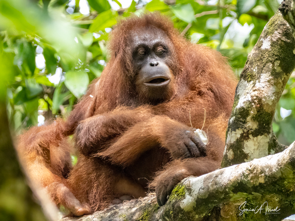 On our 7th day of the trip, while on the Kinabatangan River, the longest river in the Sabah area, we got to see our first orangutan in the wild. As we floated down the river, we suddenly noticed her way up in the tree, just sitting there and reaching out here and there for fruit.