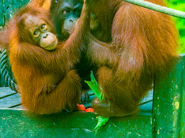 Both male and female orangutans have proportionally long arms, with an arm span of over 6 feet. But their legs are very short. And as I mentioned above, they are covered in long red hair, that starts out as bright orange when they are young (see the pictures below) and darkens to more of a maroon or chocolate color as they get older.