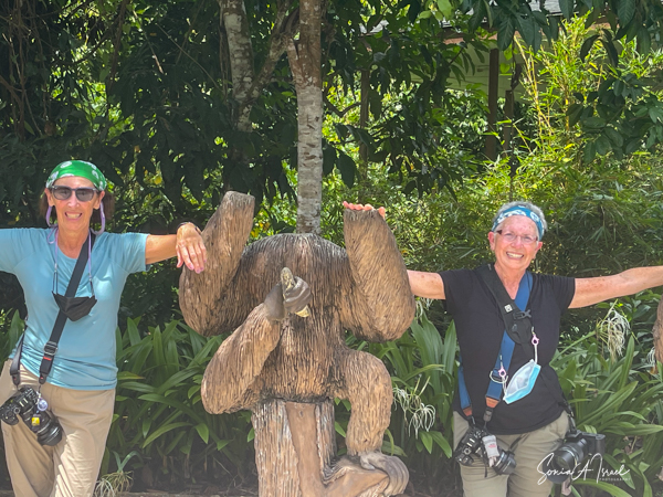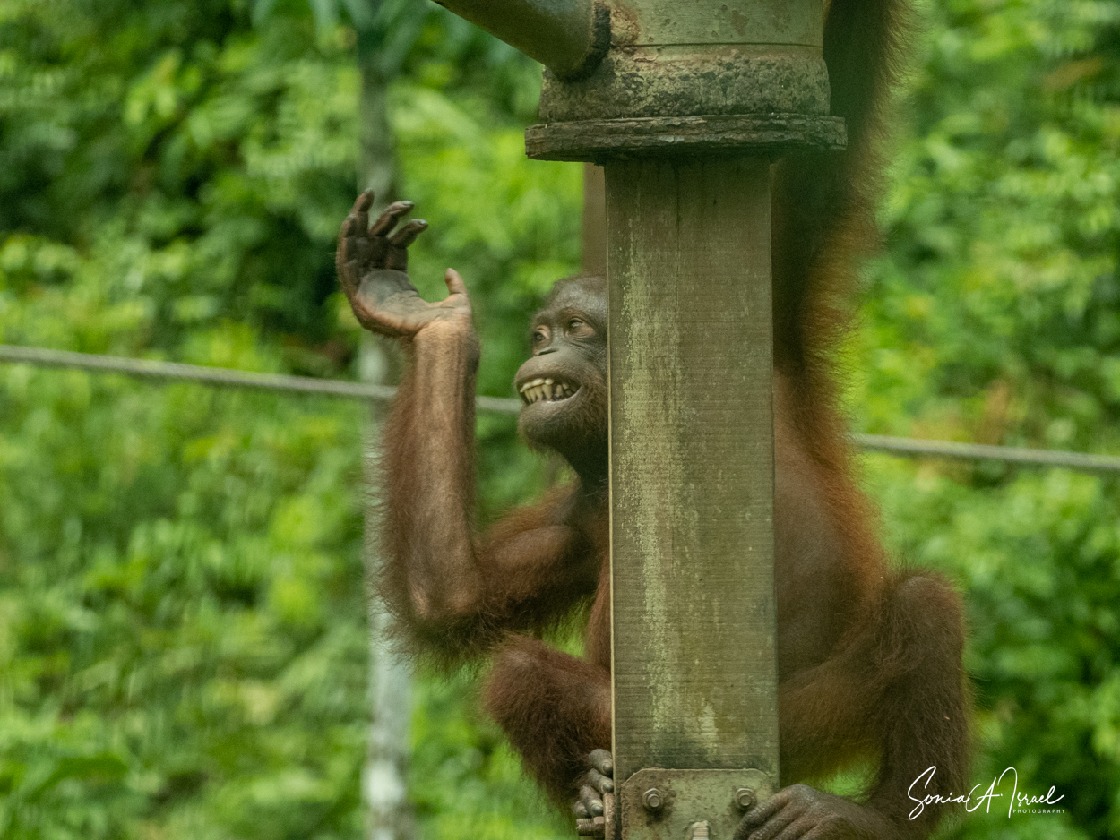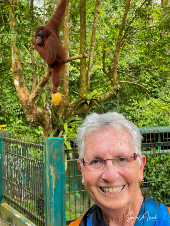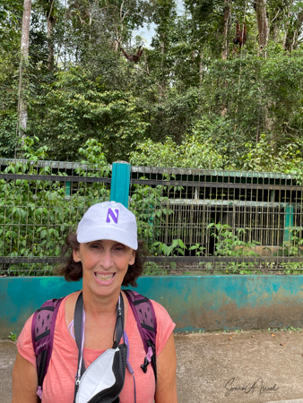 We got there in time for the afternoon feeding. We stood around, behind a low fence, looking up into the trees. We saw one or two orangutans in the trees and were so excited to take pictures with them.