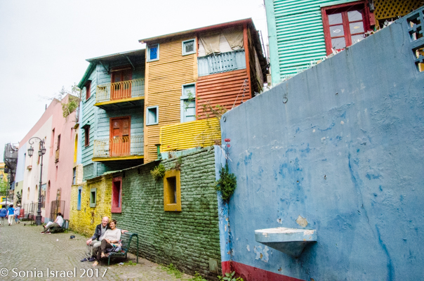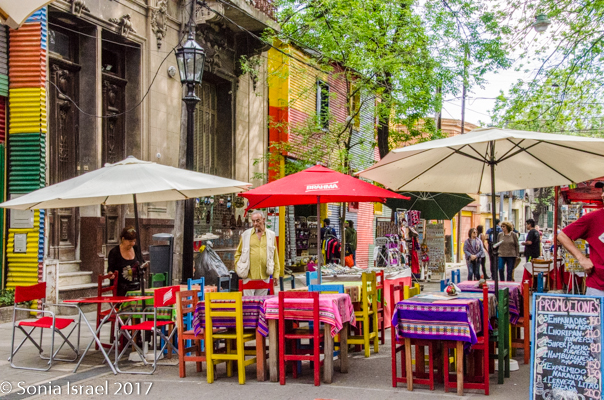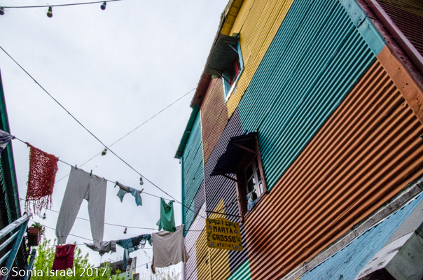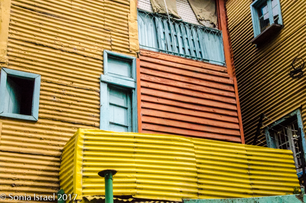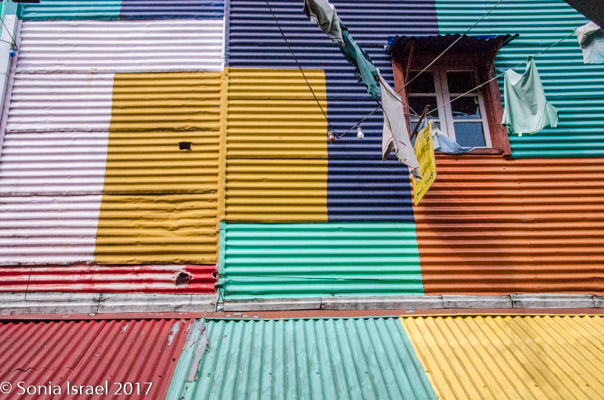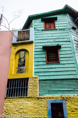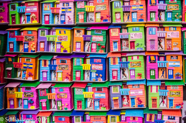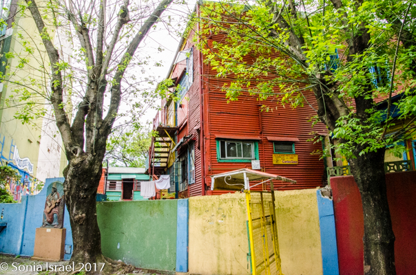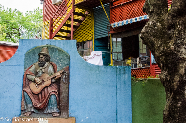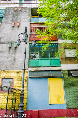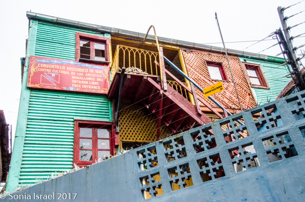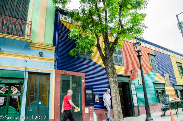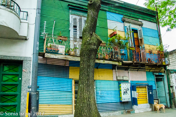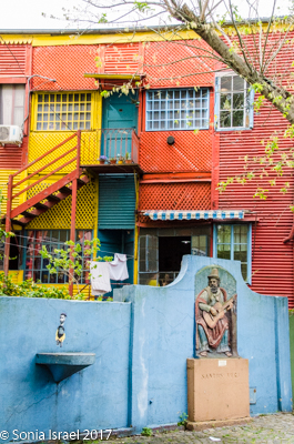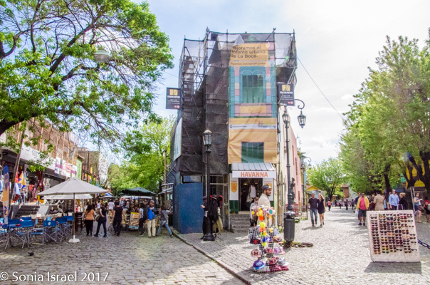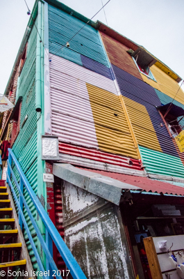 But we were really on our way to the part of La Boca that is full of color, the part that is a big tourist attraction (and we after all, were tourists). Our driver dropped us off and we walked onto the half-mile pedestrian street, called Caminito (which is also the name of a typical Argentinian tango) which is considered the soul of La Boca. It is famous for it brightly colored houses, and that is exactly what first hit our senses. Color, color, color. Not only was each house a different color, but even within the same house there were multiple colors. The houses are painted that way because the immigrants used the remaining paints found around the nearby docks to decorate their homes, which were made of metal. The streets are cobblestones at a lower level than the footpath to manage the periodic floods.