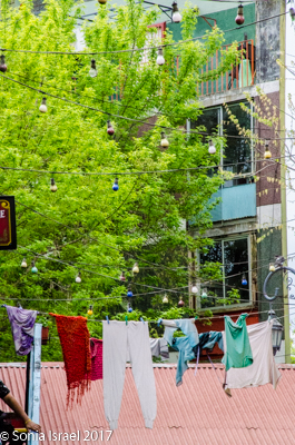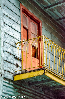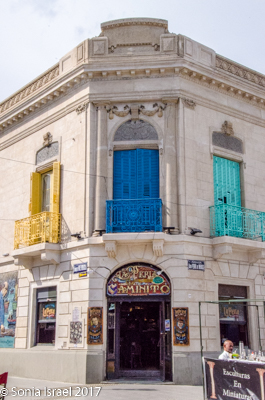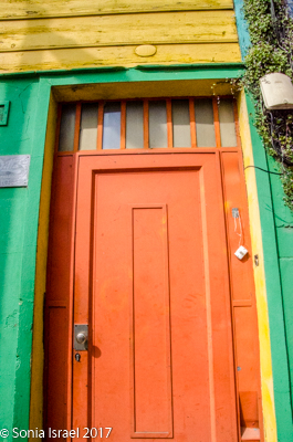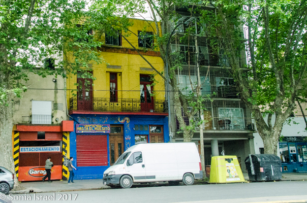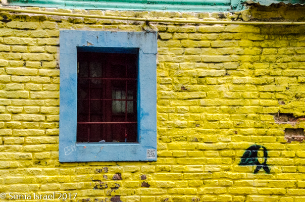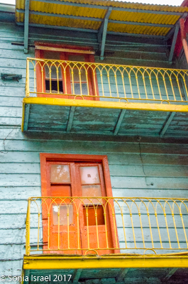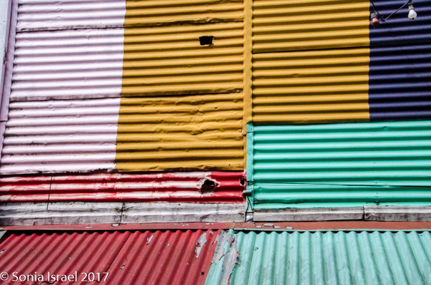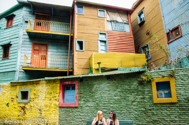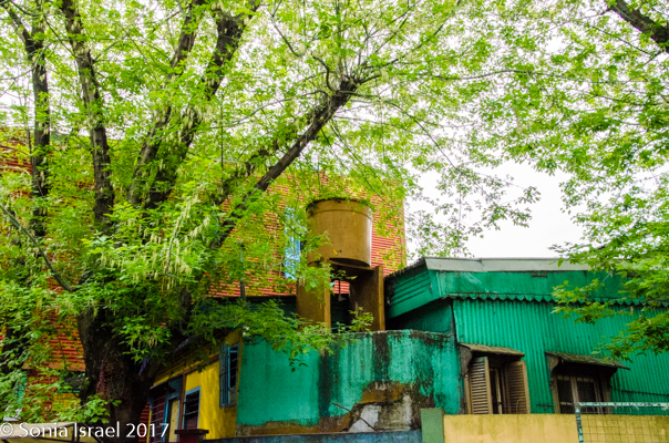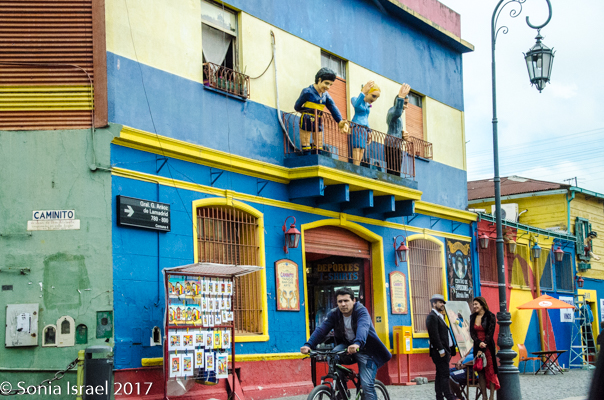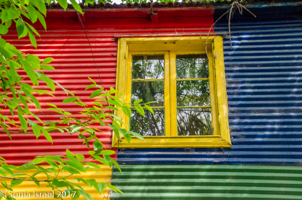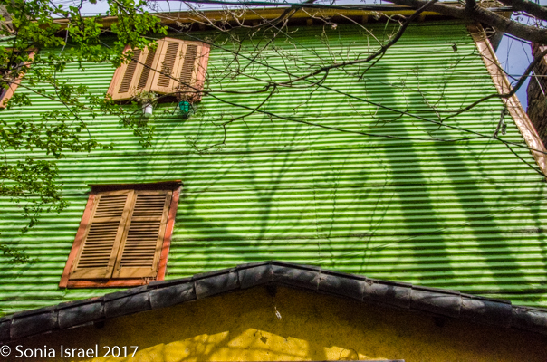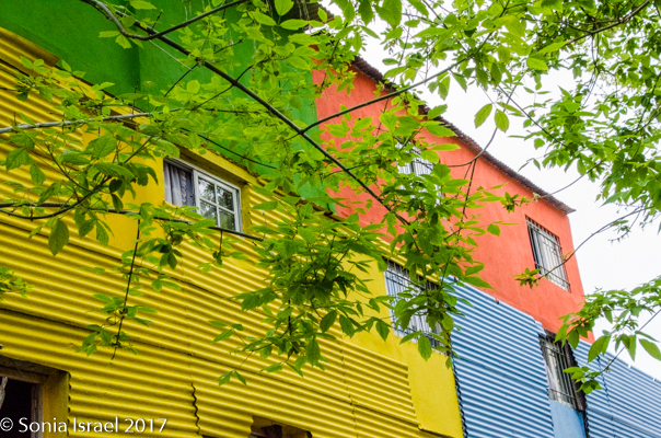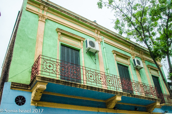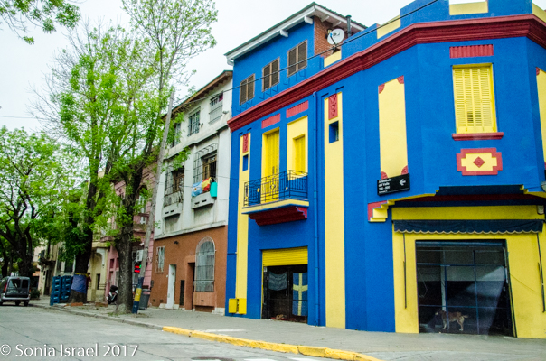 But we were really on our way to the part of La Boca that is full of color, the part that is a big tourist attraction (and we after all, were tourists). Our driver dropped us off and we walked onto the half-mile pedestrian street, called Caminito (which is also the name of a typical Argentinian tango) which is considered the soul of La Boca. It is famous for it brightly colored houses, and that is exactly what first hit our senses. Color, color, color. Not only was each house a different color, but even within the same house there were multiple colors. The houses are painted that way because the immigrants used the remaining paints found around the nearby docks to decorate their homes, which were made of metal. The streets are cobblestones at a lower level than the footpath to manage the periodic floods.