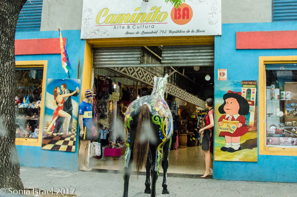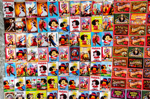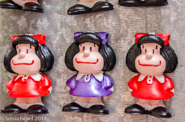 As I wrote in the main post on Buenos Aires (please see that post), Mafalda is a beloved comic strip character who is 6-years old. She was developed by a cartoonist Joaquin Salvador Lavado, known as Quino. Mafalda stole the hears of Argentinians during their most difficult time in the mid-60s to the mid-70s. Why? Because she reflected the Argentinian middle class and progressive youth, and was concerned about humanity and world peace. She loved the Beatles, Woody Woodpecker and pancakes. And she hated war, injustice, racism, and soup. At a time when Argentinians were not allowed to voice opinions, at a time when so many of them were disappearing, she was their insightful voice of social events. As a cartoon character, it was safe for her to question the state of the world at a time when real people could not. Thus, this little girl with her short black hair and a pet turtle named Bureaucracy (because it moves in slow motion) and restless mind became the symbol of many generations. We saw the image of Mafalda everywhere we went, on t-shirts, magnets, purses, all over La Boca. To this day, she is still an icon.