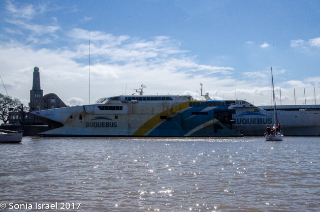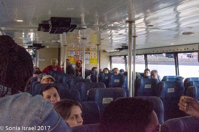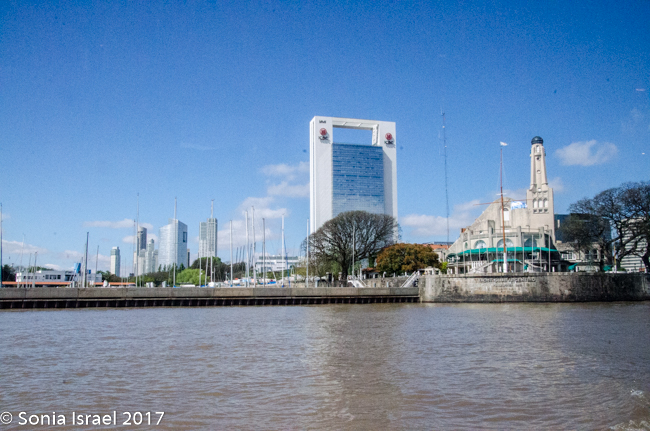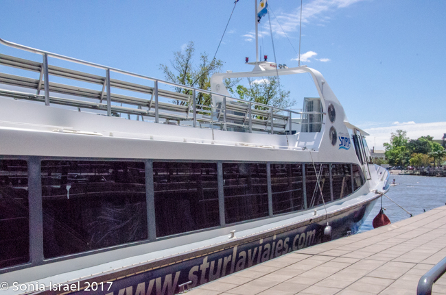 We were part of a small group of tourists. Our guide, Juliet, picked us up and after several stops to pick up others, we headed to the Puerto Madero, the port. We embarked on the boat, the Sturla Viejes, which had a deck on top, but inside looked like an airplane with three seats on each side and a narrow aisle. We were asked to stay in our seats until we were out on the water, at which point we could go up to the deck.