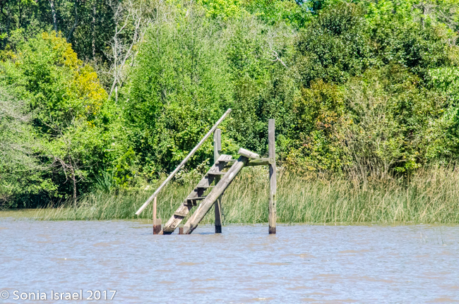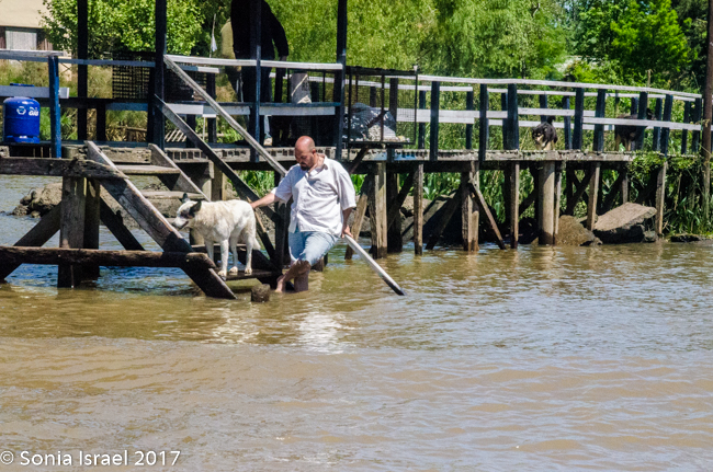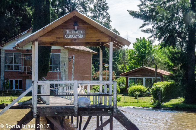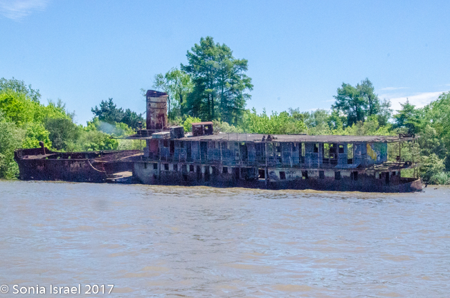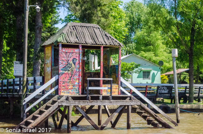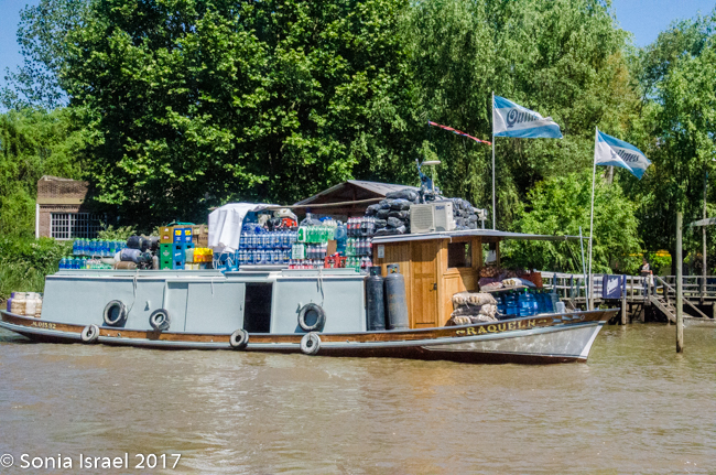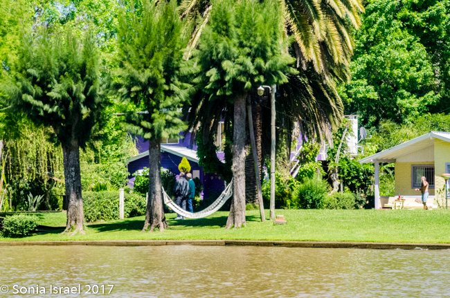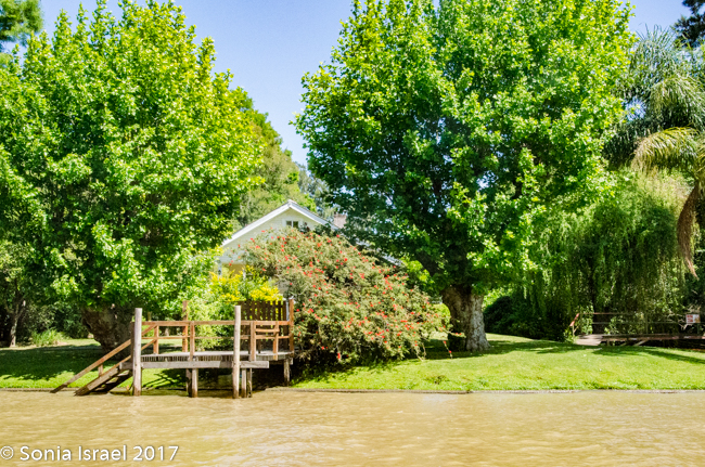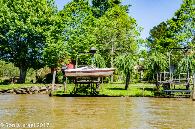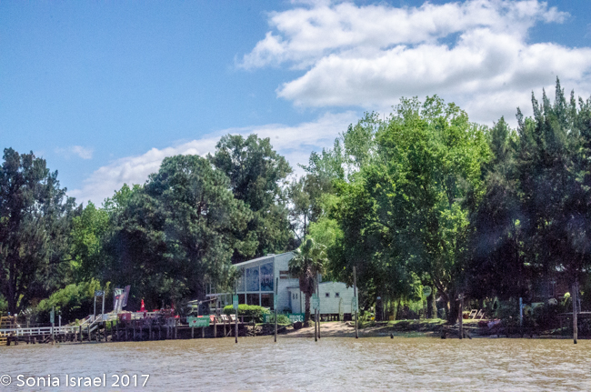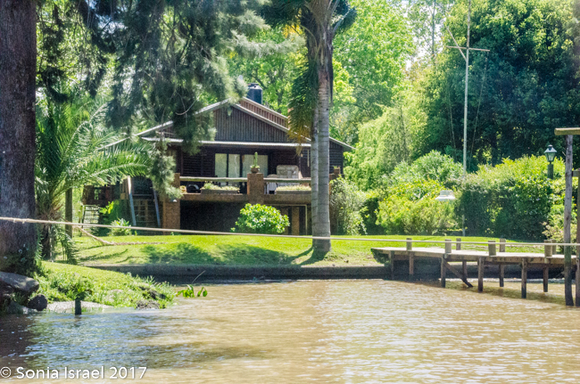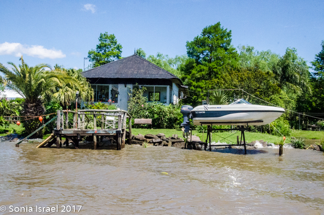 As we left the city behind us and entered the Parana Delta, with water the color of a latte as it is tinted by the sediment resulting from the large quantities of water from the rest of South American’s great rivers being forced through the smaller tributaries. We began seeing small homes, and some not so small homes, many on stilts, long the shore, each with its own boat and dock. We passed the house of former Argentina president Sarmiento, who encouraged people to make their homes here. Many of the homes are weekend homes for the wealthier Argentinians. There are no roads on most of the islands so the only way to get around is by boat. The supermarket is a boat. Garbage is collected by boat. Pizza is delivered by boat. Gas stations and restaurants can only be reached by boat. Everything comes by boat. Sort of like the floating markets of Asia.